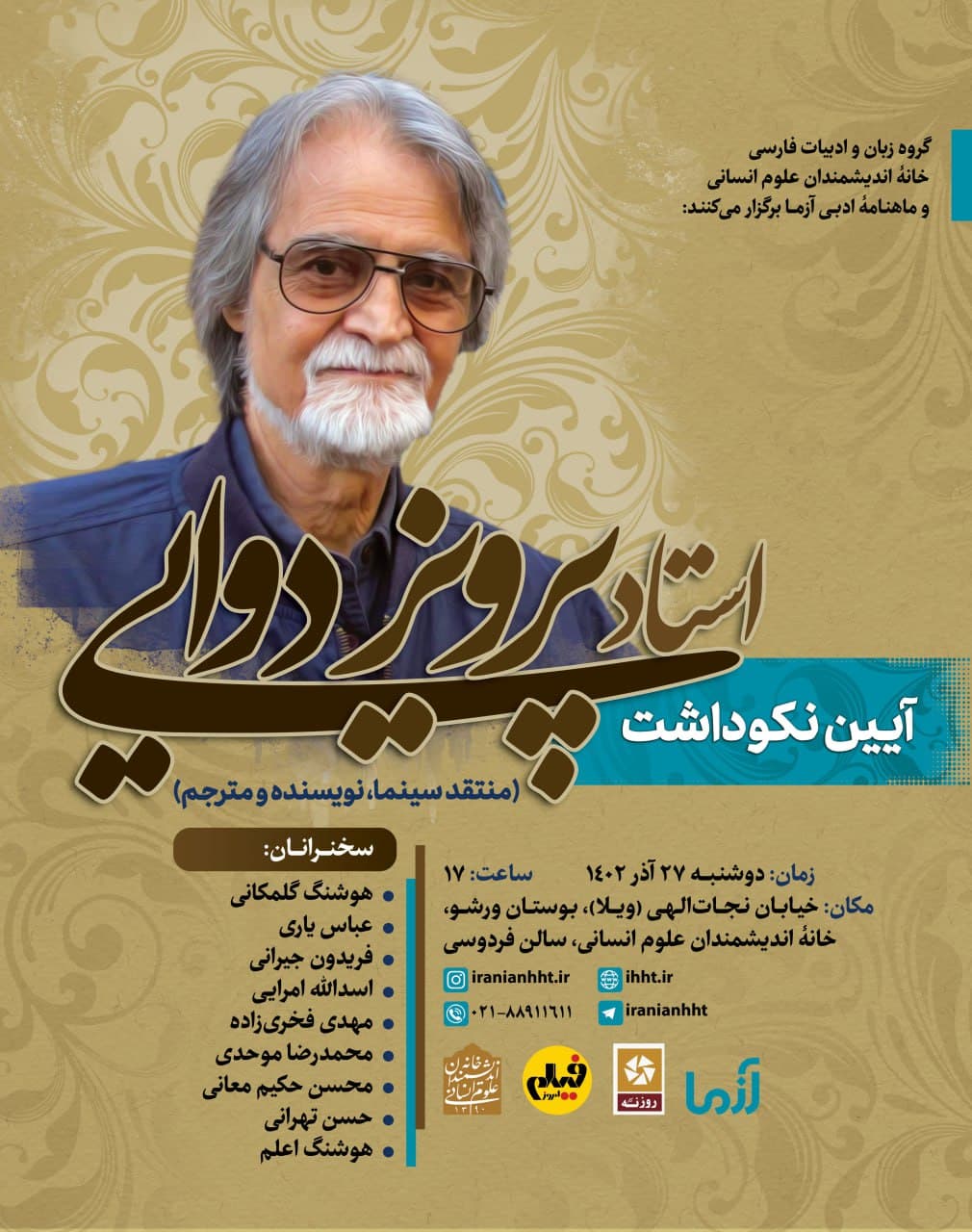 به گزارش روابط عمومی خانه اندیشمندان علوم انسانی، آیین نکوداشت "استاد پرویز دوایی" به همت گروه زبان و ادبیات فارسی خانه اندیشمندان علوم انسانی و ماهنامه ادبی آزما، روز دوشنبه ۲۷ آذر ۱۴۰۲ ساعت ۱۷ در سالن فردوسی خانه اندیشمندان علوم انسانی برگزار می شود.