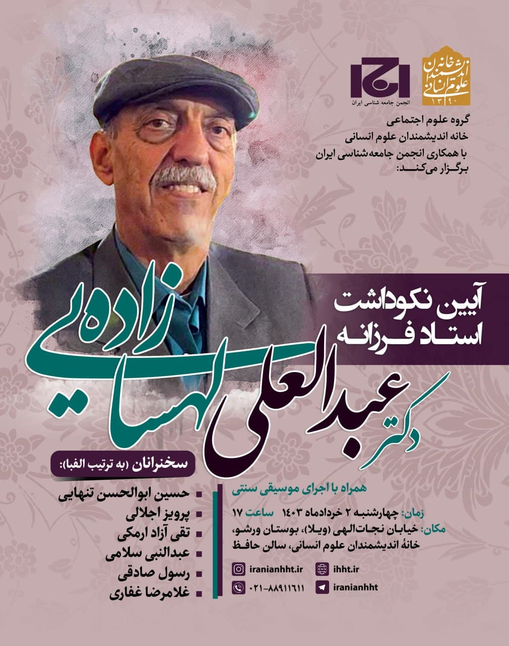 به گزارش روابط عمومی خانه اندیشمندان علوم انسانی، آیین نکوداشت "دکتر عبدالعلی لهسایی زاده" به همت گروه علوم اجتماعی خانه اندیشمندان علوم انسانی و با همکاری انجمن جامعه شناسی ایران، روز چهارشنبه 2 خرداد 1403 در سالن فردوسی خانه اندیشمندان علوم انسانی برگزار می شود.