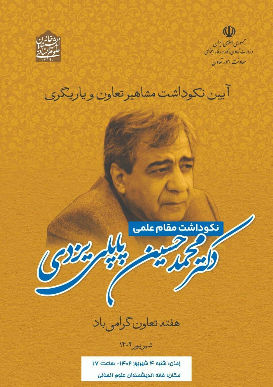 به گزارش روابط عمومی خانه اندیشمندان علوم انسانی، به مناسبت هفته تعاون، آیین نکوداشت مقام علمی "دکتر محمدحسین پاپلی یزدی" به همت وزارت تعاون، کار و رفاه اجتماعی و با همکاری خانه اندیشمندان علوم انسانی، روز شنبه ۴ شهریور ۱۴۰۲ ساعت ۱۷ در سالن فردوسی خانه اندیشمندان علوم انسانی برگزار می شود.