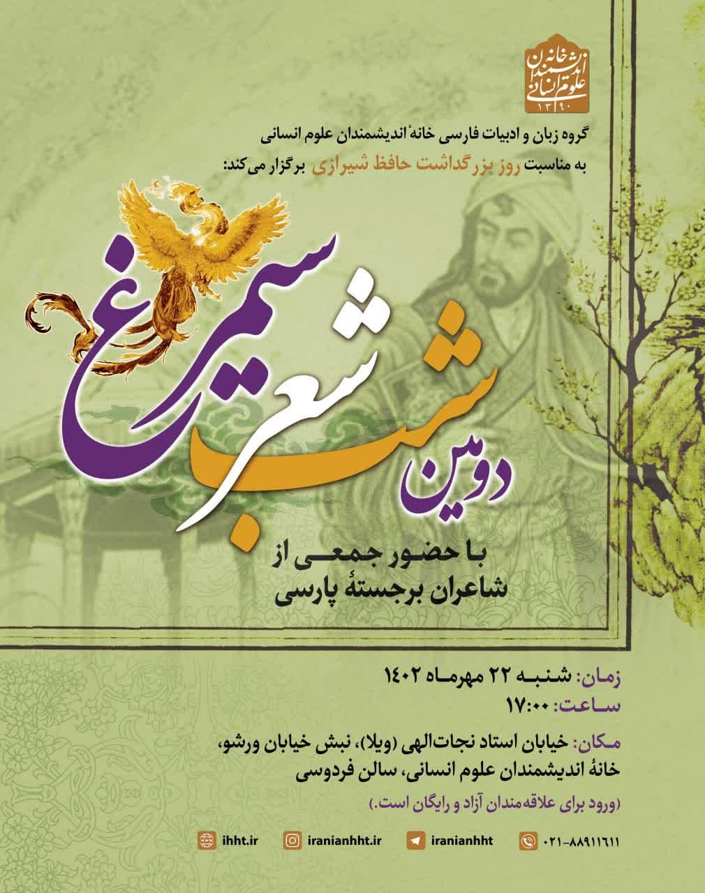 به گزارش روابط عمومی خانه اندیشمندان علوم انسانی، دومین شب شعر سیمرغ، به همت گروه زبان و ادبیات فارسی خانه اندیشمندان علوم انسانی، روز شنبه ۲۲ مهر ۱۴۰۲ ساعت ۱۷ با حضور جمعی از شاعران برجسته پارسی در سالن فردوسی خانه اندیشمندان علوم انسانی برگزار می شود.