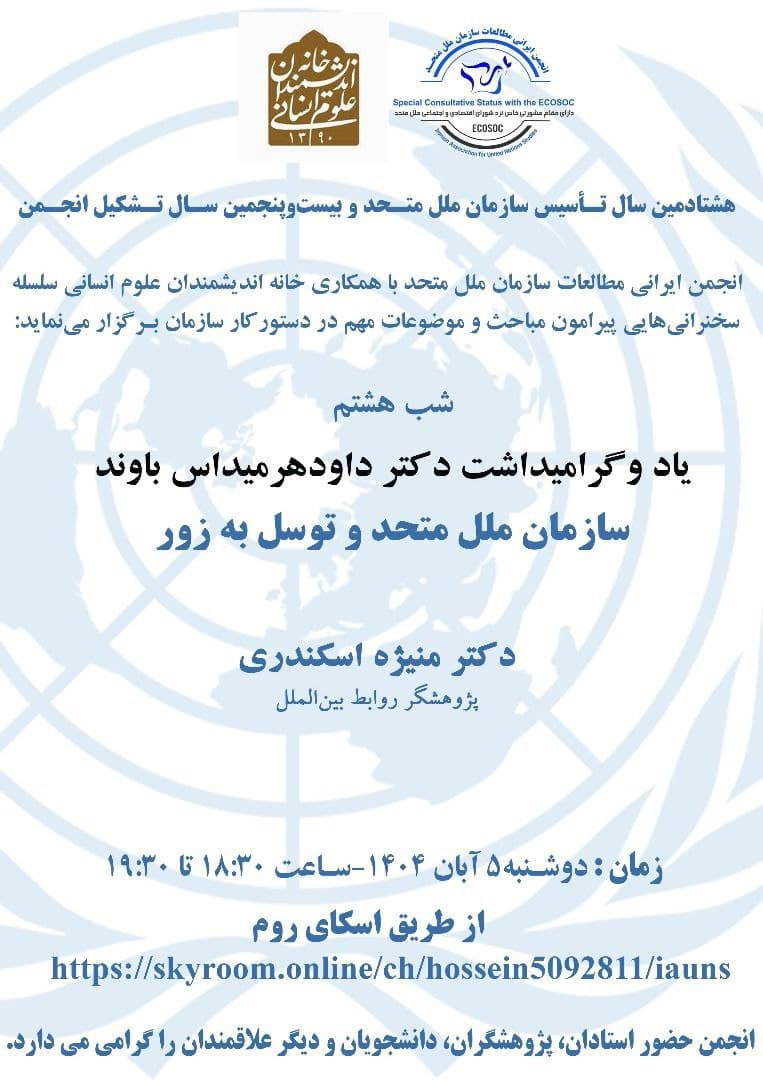 به گزارش روابط عمومی خانه اندیشمندان علوم انسانی، نشست "سازمان ملل متحد و توسل به زور؛ همراه با یاد و گرامیداشت دکتر داود هرمیداس باوند" به همت انجمن ایرانی مطالعات سازمان ملل متحد و با همکاری خانه اندیشمندان علوم انسانی، روز دوشنبه 5 آبان 1404 ساعت 18:30 در بستر اسکای روم برگزار می شود.