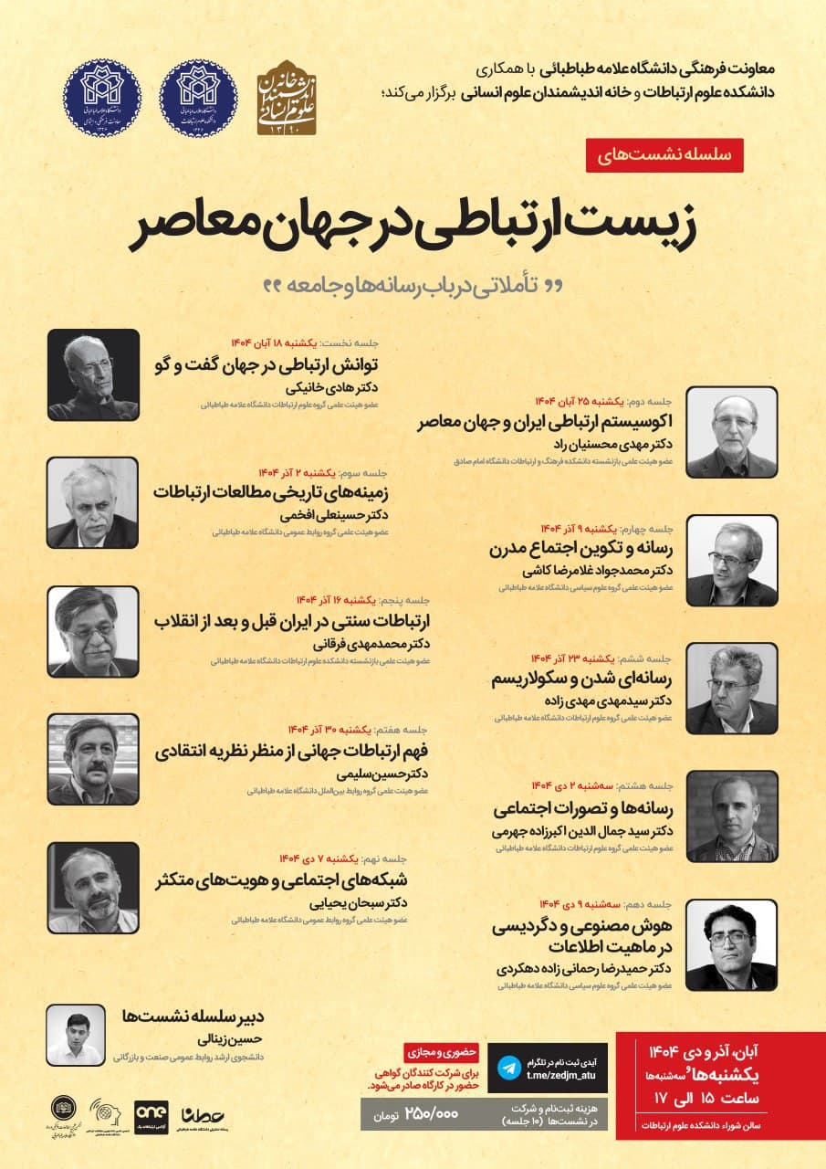 به گزارش روابط عمومی خانه اندیشمندان علوم انسانی، سلسله نشست های زیست ارتباطی در جهان معاصر (تاملاتی در باب رسانه و جامعه)، به همت معاونت فرهنگی دانشگاه علامه طباطبائی و با همکاری دانشکده علوم ارتباطات و خانه اندیشمندان علوم انسانی، از 18 آبان 1404 روزهای یکشنبه و سه شنبه در دانشکده علوم ارتباطات به صورت حضوری و مجازی برگزار می شود.