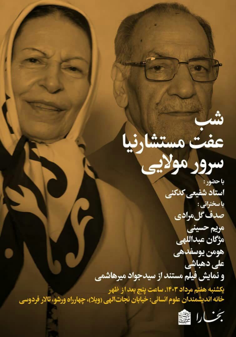 شب "عفت مستشارنیا و سرور مولایی" روز یکشنبه 7 مرداد در سالن فردوسی خانه اندیشمندان علوم انسانی برگزار می شود.