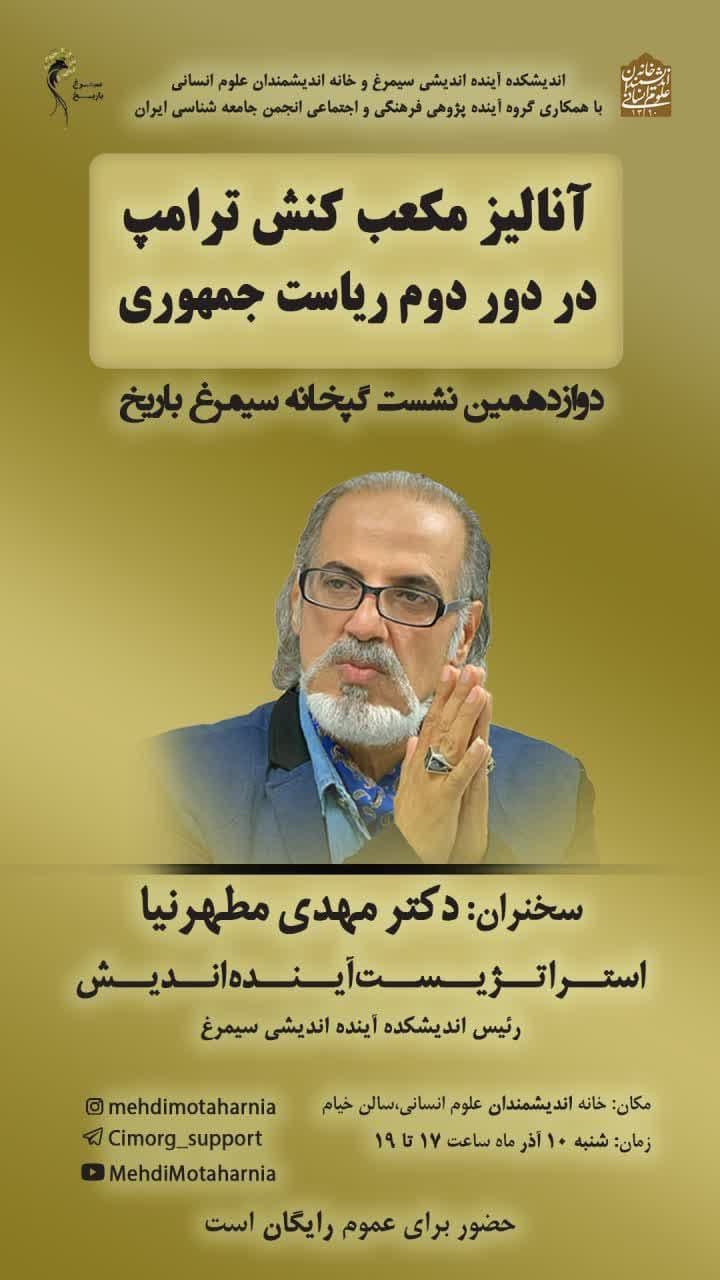 نشست "آنالیز مکعب کنش ترامپ در دور دوم ریاست جمهوری" روز شنبه 10 آذر در سالن خیام خانه اندیشمندان علوم انسانی برگزار می شود.