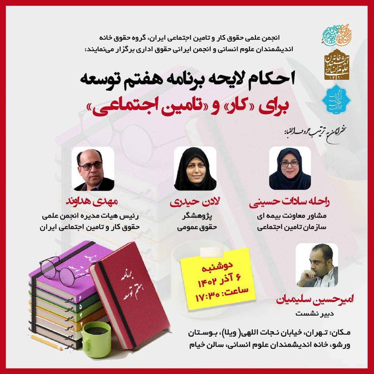 به گزارش روابط عمومی خانه اندیشمندان علوم انسانی، نشست "احکام لایحه برنامه هفتم توسعه برای کار و تامین اجتماعی" به همت انجمن علمی حقوق کار و تامین اجتماعی ایران، گروه حقوق خانه اندیشمندان علوم انسانی و انجمن ایرانی حقوق اداری، روز دوشنبه ۶ آذر ۱۴۰۲ ساعت ۱۷:۳۰ در سالن خیام خانه اندیشمندان علوم انسانی برگزار می شود.