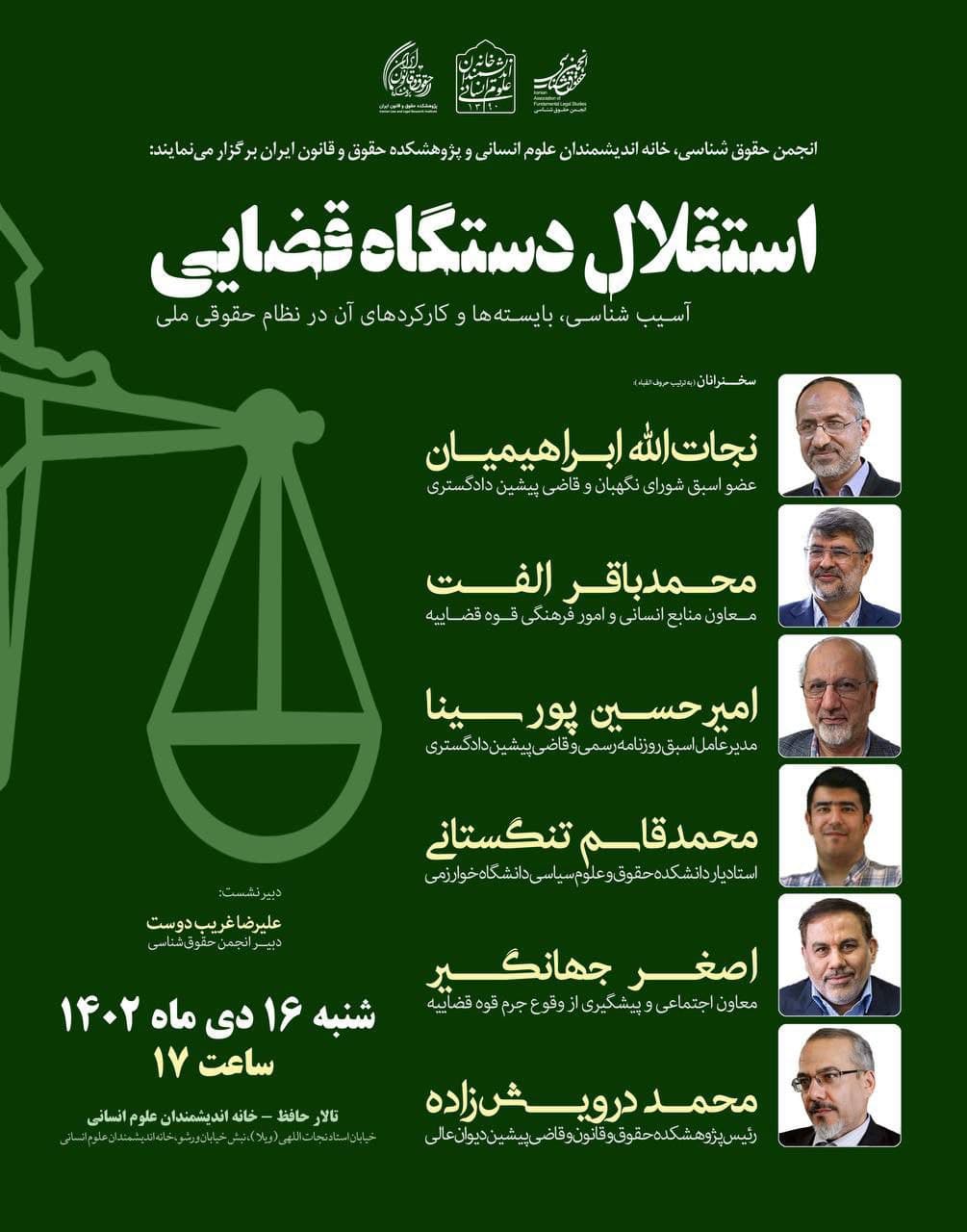 نشست "استقلال دستگاه قضایی" روز شنبه ۱۶ دی در سالن حافظ خانه اندیشمندان علوم انسانی برگزار می شود.