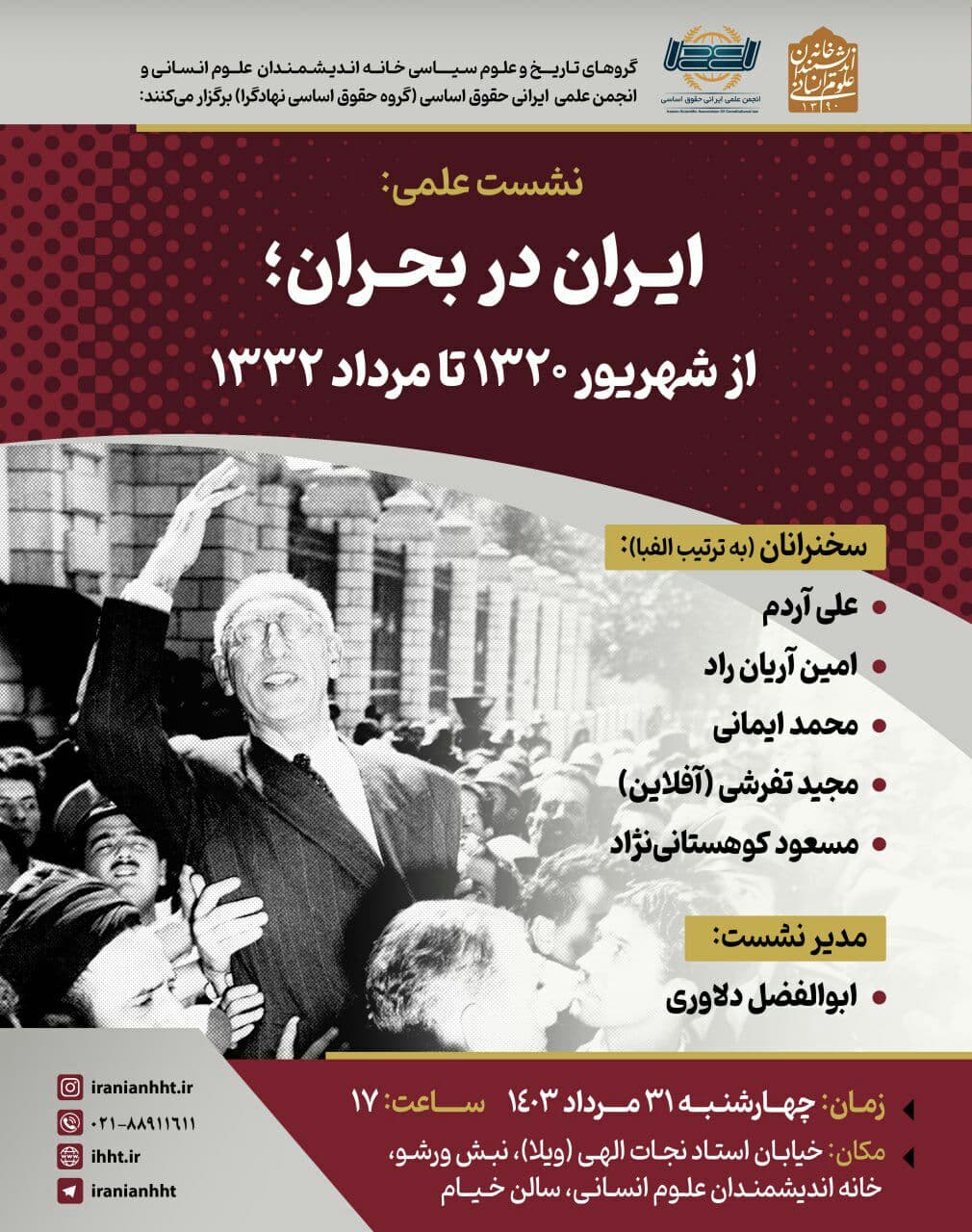 نشست "ایران در بحران؛ از شهریور ۱۳۲۰ تا مرداد ۱۳۳۲" روز چهارشنبه ۳۱ مرداد در سالن خیام خانه اندیشمندان علوم انسانی برگزار می شود.