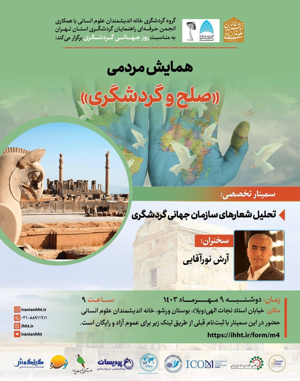 نشست "تحلیل شعارهای سازمان جهانی گردشگری" روز دوشنبه 9 مهر در خانه اندیشمندان علوم انسانی برگزار می شود.