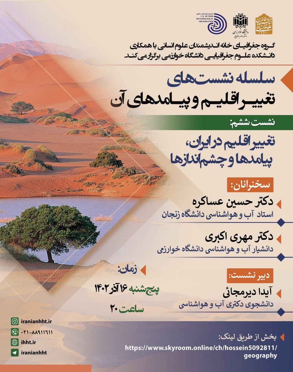 به گزارش روابط عمومی خانه اندیشمندان علوم انسانی، نشست "تغییر اقلیم در ایران، پیامدها و چشم اندازها" به همت گروه جغرافیای خانه اندیشمندان علوم انسانی و با همکاری دانشکده علوم جغرافیایی دانشگاه خوارزمی، روز پنج شنبه ۱۶ آذر ۱۴۰۲ ساعت ۲۰ به صورت مجازی برگزار می شود.