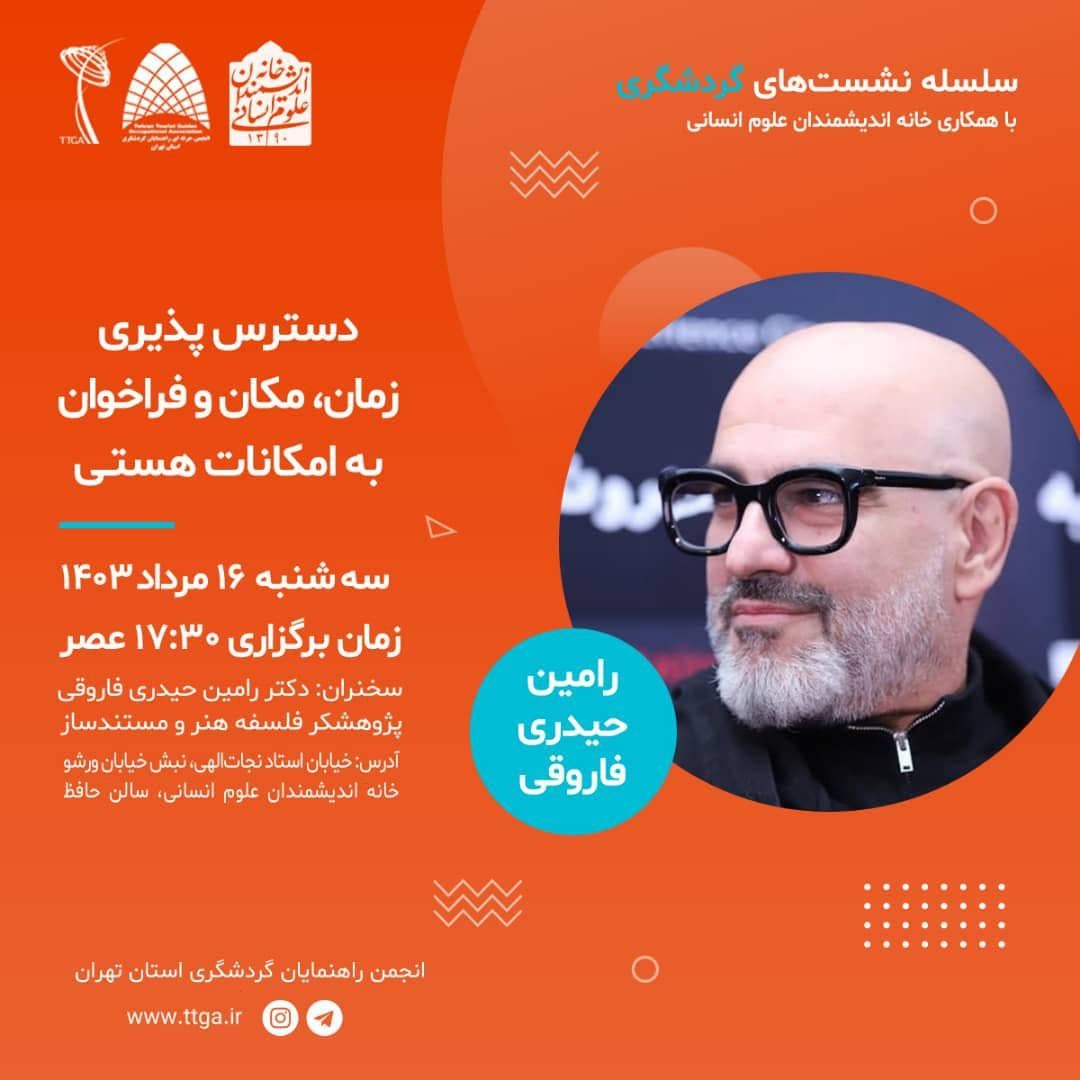 به گزارش روابط عمومی خانه اندیشمندان علوم انسانی، نشست "دسترس پذیری زمان، مکان و فراخوان به امکانات هستی" به همت انجمن حرفه ای راهنمایان گردشگری استان تهران و با همکاری خانه اندیشمندان علوم انسانی، روز سه شنبه 16 مرداد 1403 ساعت 17:30 در سالن حافظ خانه اندیشمندان علوم انسانی برگزار می شود.