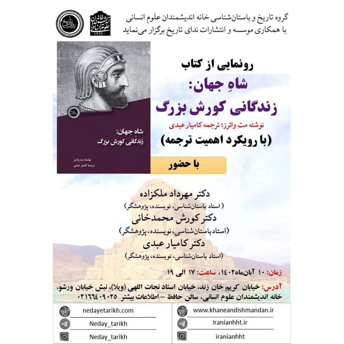 به گزارش روابط عمومی خانه اندیشمندان علوم انسانی، نشست "رونمایی از کتاب شاه جهان: زندگانی کورش بزرگ" به همت گروه تاریخ و باستان شناسی خانه اندیشمندان علوم انسانی و با همکاری موسسه و انتشارات ندای تاریخ، روز چهارشنبه ۱۰ آبان ۱۴۰۲ ساعت ۱۷ در سالن حافظ خانه اندیشمندان علوم انسانی برگزار می شود.