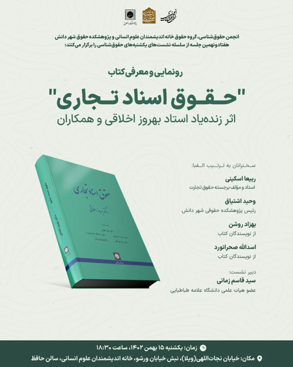 به گزارش روابط عمومی خانه اندیشمندان علوم انسانی، نشست "رونمایی و معرفی کتاب حقوق اسناد تجاری" به همت انجمن حقوق شناسی ایران، گروه حقوق خانه اندیشمندان علوم انسانی و پژوهشکده حقوق شهر دانش، روز یکشنبه ۱۵ بهمن ۱۴۰۲ ساعت ۱۸:۳۰ در سالن حافظ خانه اندیشمندان علوم انسانی برگزار می شود.