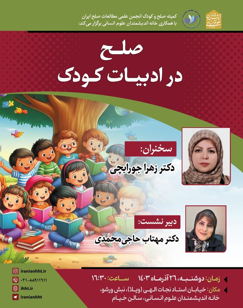 نشست "صلح در ادبیات کودک" روز دوشنبه 26 آذر در سالن خیام خانه اندیشمندان علوم انسانی برگزار می شود.