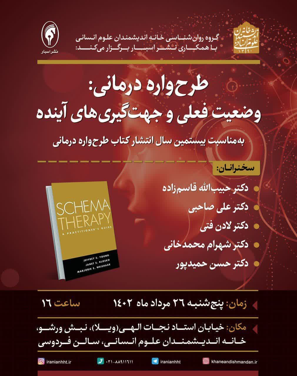 به گزارش روابط عمومی خانه اندیشمندان علوم انسانی، نشست "طرح واره درمانی: وضعیت فعلی و جهت گیری های آینده" به همت گروه روان شناسی خانه اندیشمندان علوم انسانی و با همکاری نشر اسبار، روز پنج شنبه ۲۶ مرداد ۱۴۰۲ ساعت ۱۶ در سالن فردوسی خانه اندیشمندان علوم انسانی برگزار می شود.