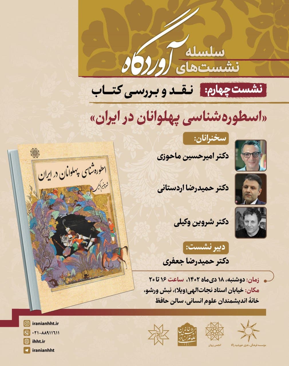 نشست "نقد و بررسی کتاب اسطوره شناسی پهلوانان در ایران" روز دوشنبه ۱۸ دی در سالن حافظ خانه اندیشمندان علوم انسانی برگزار می شود.