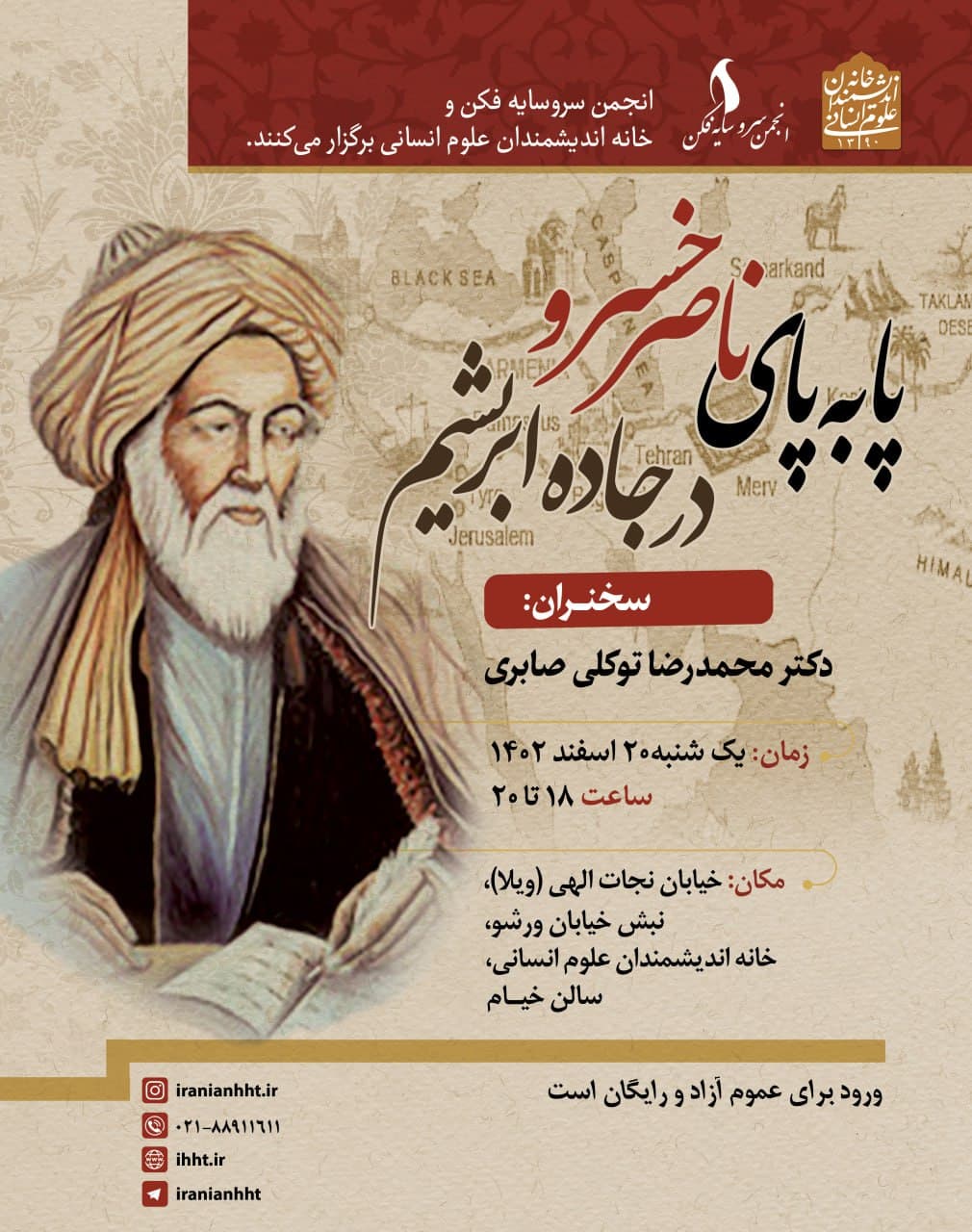 به گزارش روابط عمومی خانه اندیشمندان علوم انسانی، نشست "پا به پای ناصر خسرو در جاده ابریشم" به همت انجمن سرو سایه فکن و خانه اندیشمندان علوم انسانی، روز یکشنبه ۲۰ اسفند ۱۴۰۲ ساعت ۱۸ در سالن خیام خانه اندیشمندان علوم انسانی برگزار می شود.