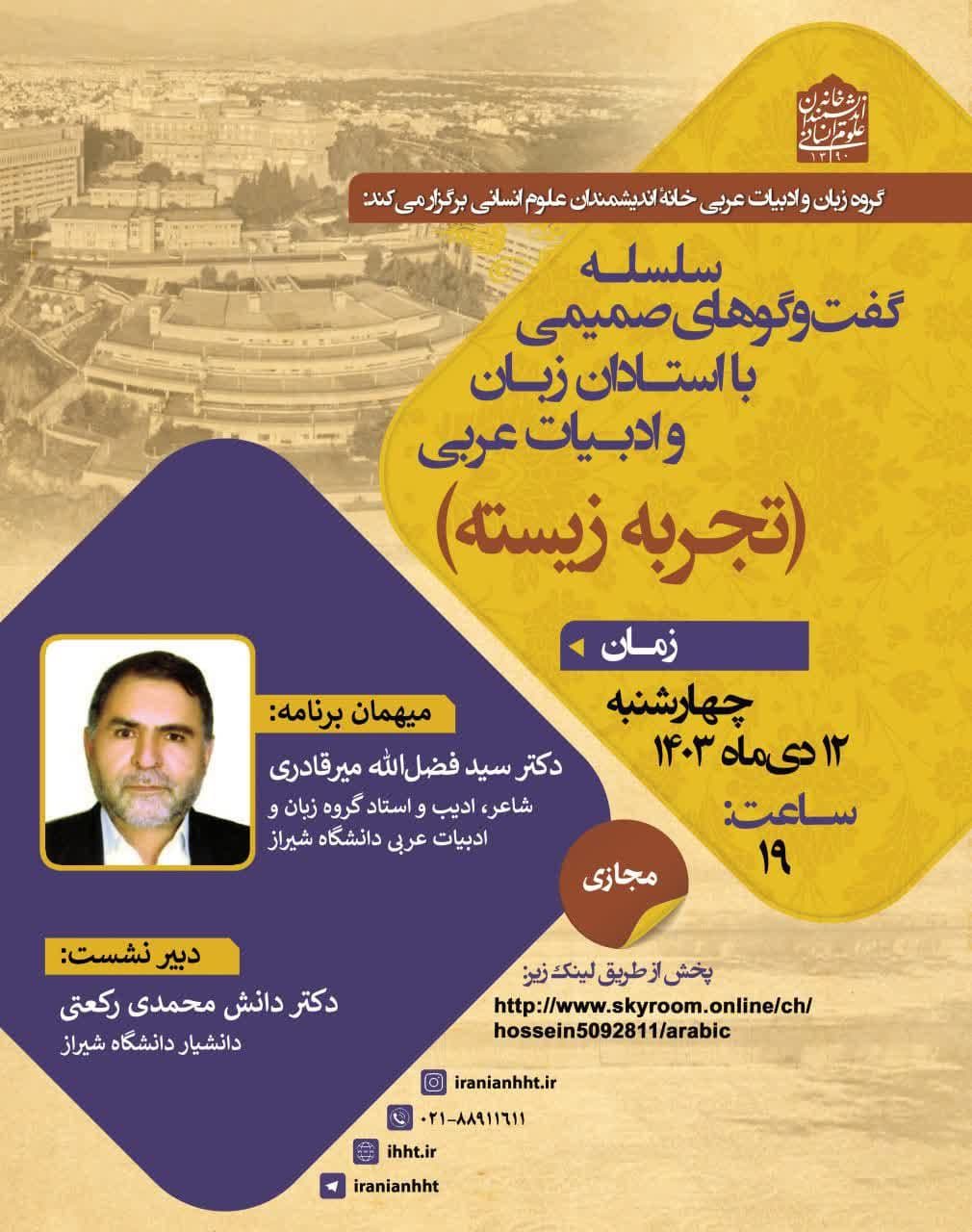 به گزارش روابط عمومی خانه اندیشمندان علوم انسانی، نشست "گپ و گفتی با دکتر سید فضل الله میرقادری" به همت گروه زبان و ادبیات عربی خانه اندیشمندان علوم انسانی، روز چهارشنبه 12 دی 1403 ساعت 19 در بستر اسکای روم برگزار می شود.