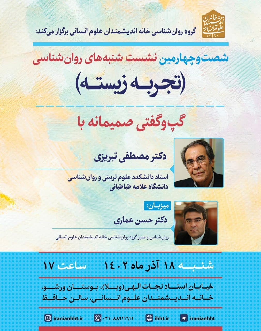به گزارش روابط عمومی خانه اندیشمندان علوم انسانی، نشست "گپ و گفتی صمیمانه با مصطفی تبریزی" به همت گروه روان شناسی خانه اندیشمندان علوم انسانی، روز شنبه ۱۸ آذر ۱۴۰۲ ساعت ۱۷ در سالن حافظ خانه اندیشمندان علوم انسانی با حضور مصطفی تبریزی استاد دانشگاه علامه طباطبائی برگزار می شود.