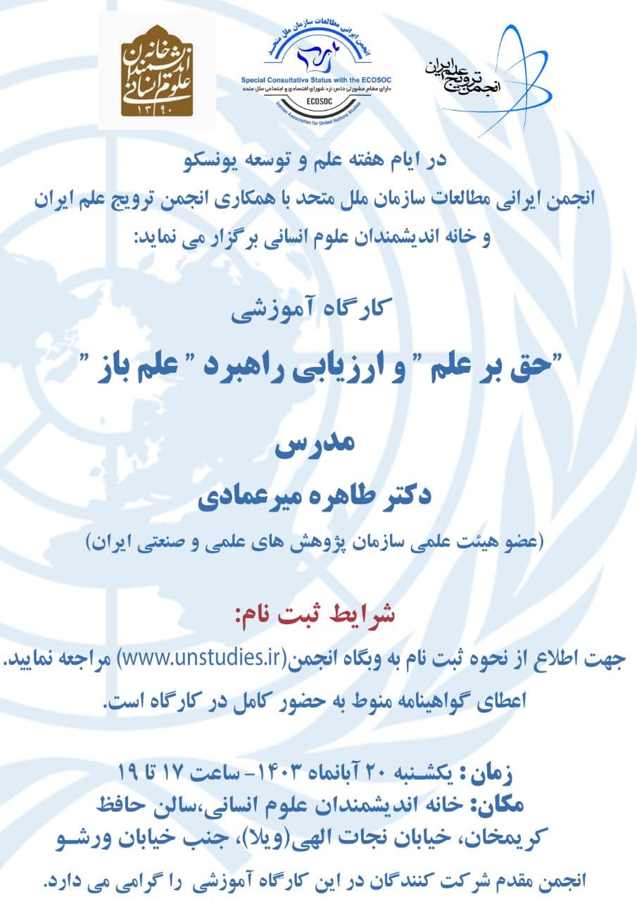به گزارش روابط عمومی خانه اندیشمندان علوم انسانی، کارگاه آموزشی "حق برعلم و ارزیابی راهبرد علم باز" به همت انجمن مطالعات سازمان ملل متحد و با همکاری خانه اندیشمندان علوم انسانی، روز یکشنبه 20 آبان 1403 ساعت 17 در سالن حافظ خانه اندیشمندان علوم انسانی برگزار می شود.