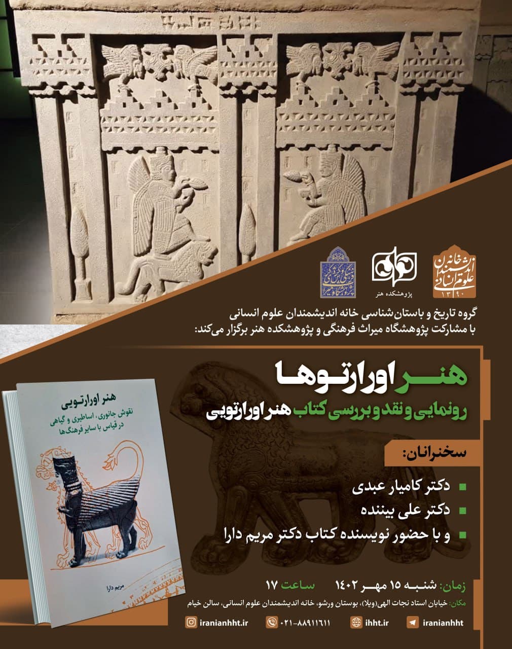 به گزارش روابط عمومی خانه اندیشمندان علوم انسانی، نشست "هنر اورارتوها" به همت گروه تاریخ و باستان شناسی خانه اندیشمندان علوم انسانی، روز شنبه ۱۵ مهر ۱۴۰۲ در سالن خیام خانه اندیشمندان علوم انسانی برگزار شد. در این نشست از کتاب "هنر اورارتویی" رونمایی شد.