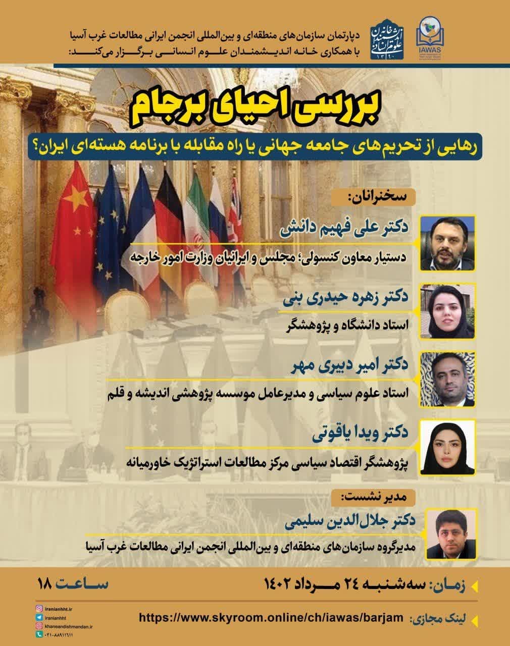 نشست "بررسی احیای برجام" روز سه شنبه ۲۴ مرداد در سالن حافظ خانه اندیشمندان علوم انسانی برگزار خواهد شد.