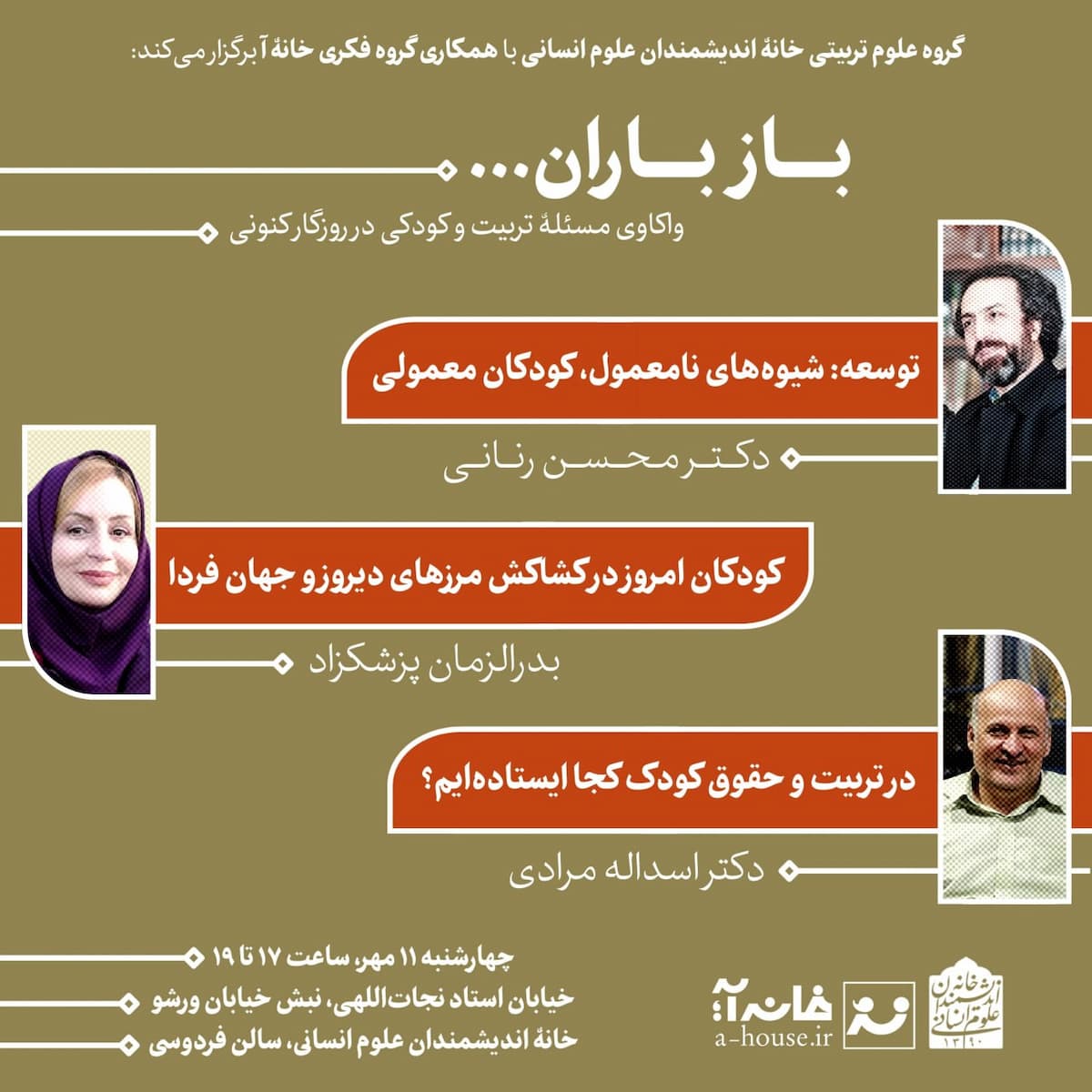 نشست "باز باران؛ واکاوی مسئله تربیت و کودکی در روزگار کنونی" روز چهارشنبه ۱۱ مهر در سالن فردوسی خانه اندیشمندان علوم انسانی برگزار شد.