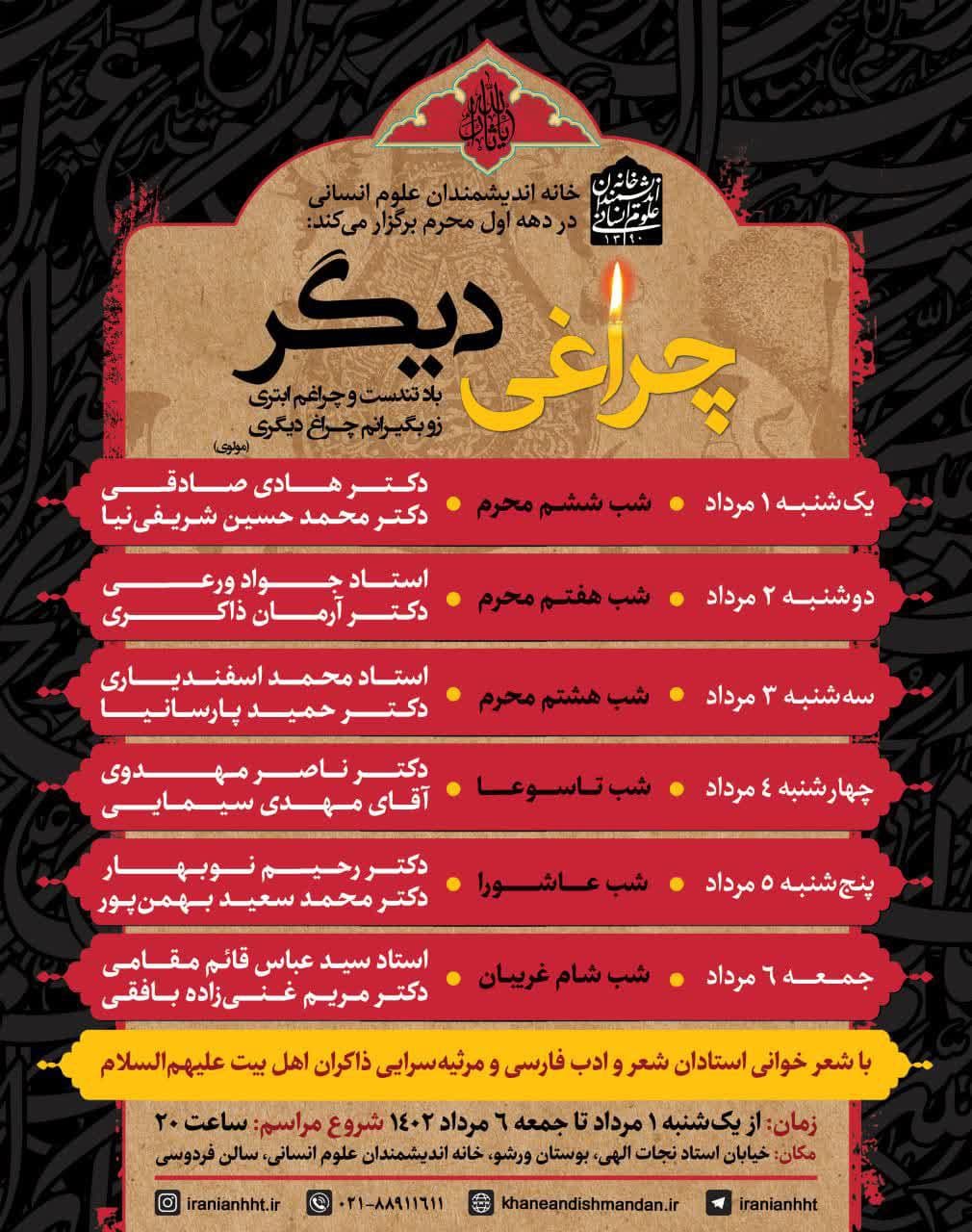 به گزارش روابط عمومی خانه اندیشمندان علوم انسانی، ویژه برنامه ماه محرم خانه اندیشمندان علوم انسانی «چراغی دیگر» همچون سالهای گذشته برگزار میشود.