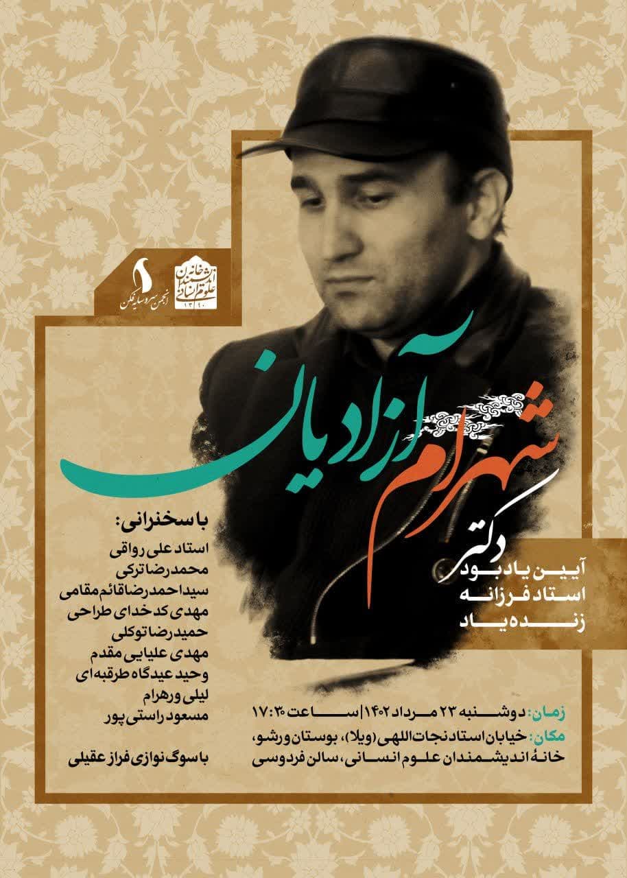 آیین یادبود "شهرام آزادیان" استاد فقید زبان و ادبیات فارسی دانشگاه تهران، ۲۳ مرداد در سالن فردوسی خانه اندیشمندان علوم انسانی برگزار شد.