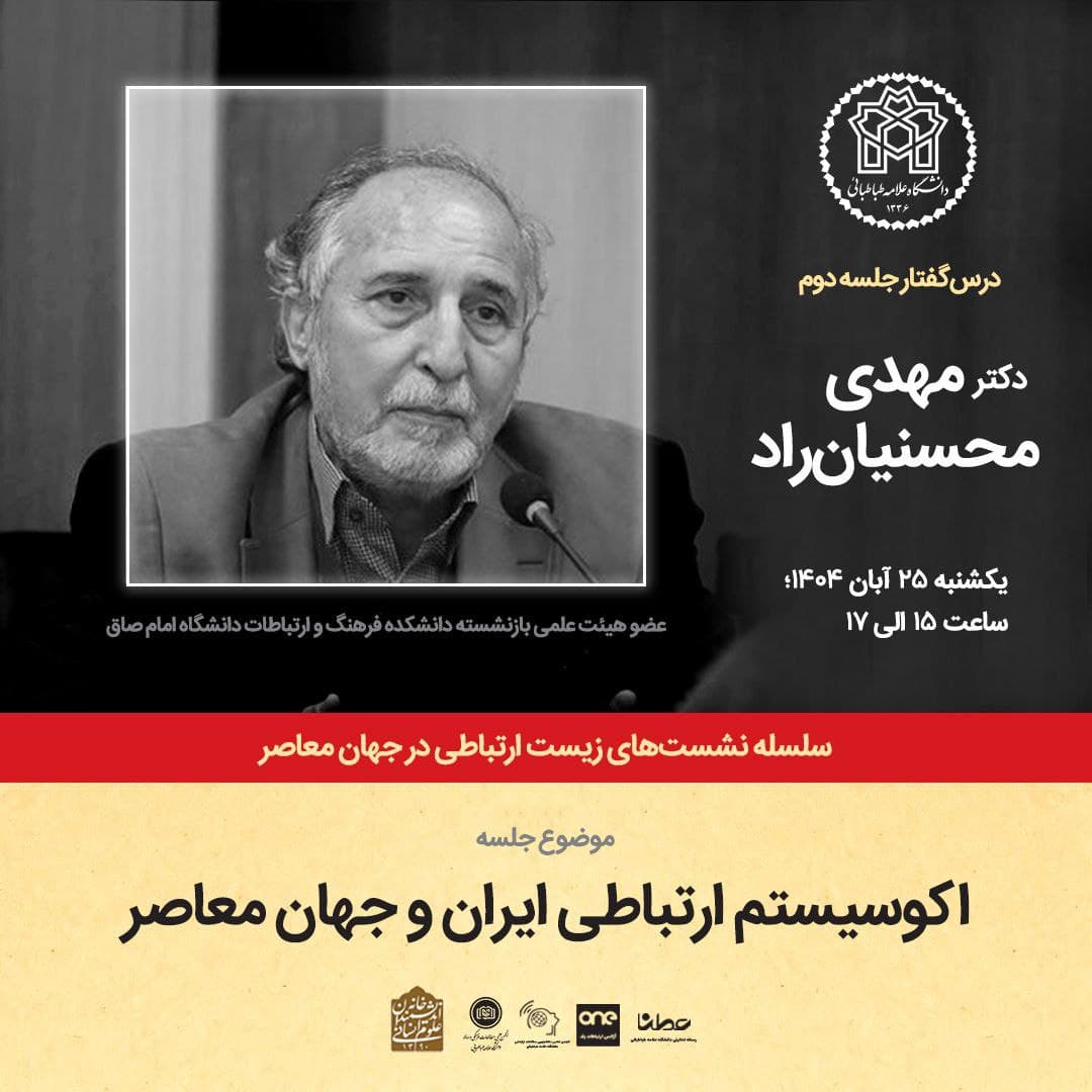 دومین نشست از سلسله نشستهای «زیست ارتباطی در جهان معاصر» در دانشگاه علامه طباطبایی، با محوریت یکی از بحثبرانگیزترین و قدیمیترین چهرههای علوم ارتباطات در ایران برگزار شد؛ نشستی که اینبار قرار بود «اکوسیستم ارتباطی ایران و جهان معاصر» را زیر ذرهبین مهدی محسنیانراد بگذارد؛ استاد بازنشسته دانشگاه امام صادق(ع) که نامش با کتاب «ایران در چهار کهکشان ارتباطی» برای چند نسل از دانشجویان ارتباطات آشناست.