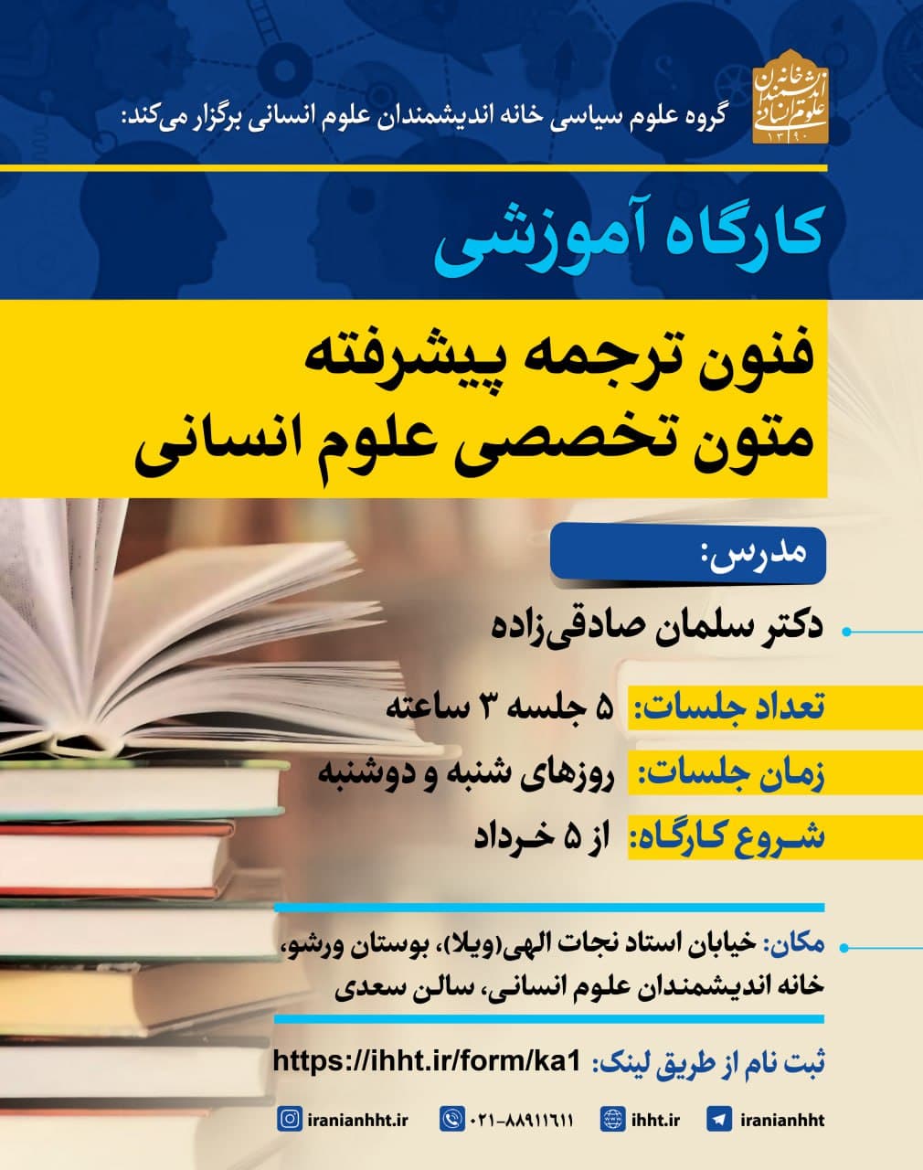 کارگاه آموزشی فنون ترجمه پیشرفته متون تخصصی علوم انسانی، از 5 خرداد در سالن سعدی خانه اندیشمندان علوم انسانی برگزار می شود.