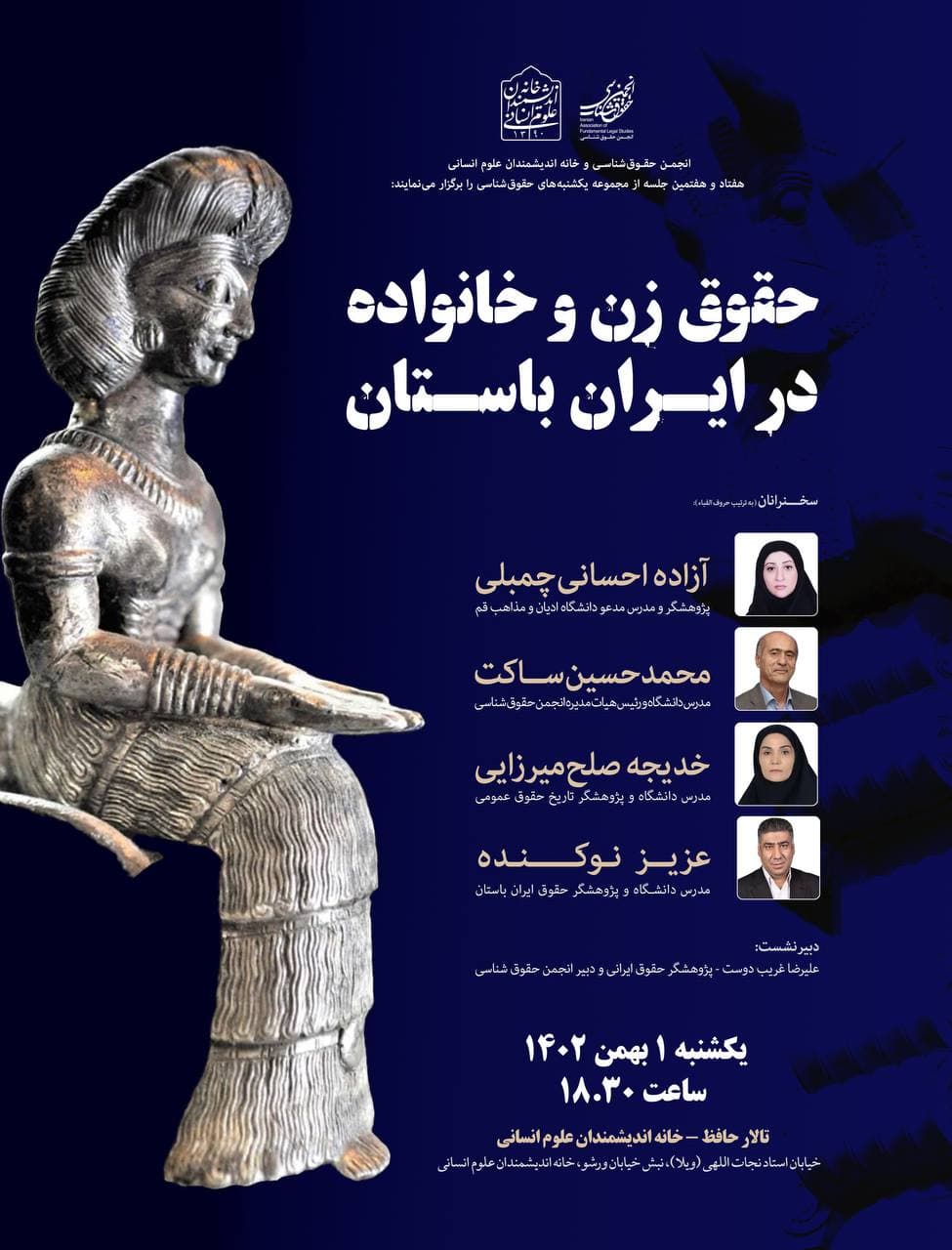 نشست "حقوق و زن خانواده در ایران باستان" روز یکشنبه ۱ بهمن در سالن حافظ خانه اندیشمندان علوم انسانی برگزار می شود.