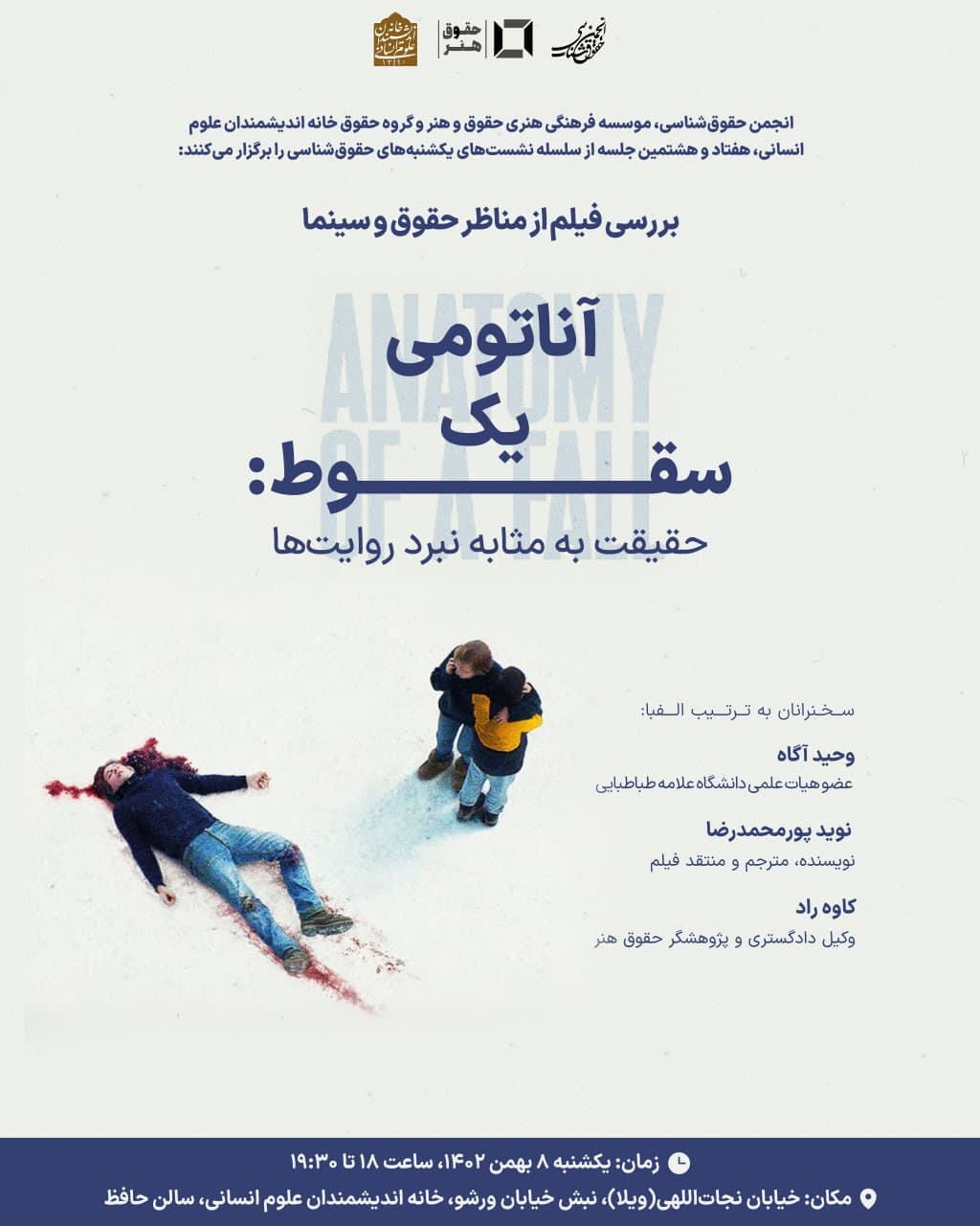 به گزارش روابط عمومی خانه اندیشمندان علوم انسانی، نشست "آناتومی یک سقوط: حقیقت به مثابه نبرد روایت ها" به همت انجمن حقوق شناسی، موسسه فرهنگی هنری حقوق و هنر و گروه حقوق خانه اندیشمندان علوم انسانی، روز یکشنبه ۸ بهمن ۱۴۰۲ ساعت ۱۸ در سالن حافظ خانه اندیشمندان علوم انسانی برگزار می شود.