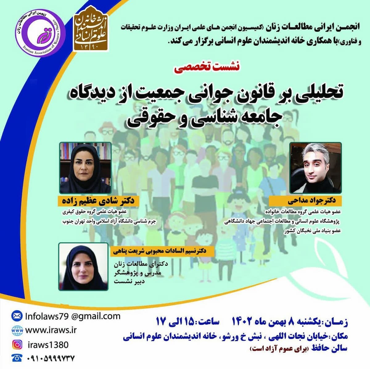 به گزارش روابط عمومی خانه اندیشمندان علوم انسانی، نشست "تحلیلی بر قانون جوانی جمعیت از دیدگاه جامعه شناسی و حقوق" به همت انجمن ایرانی مطالعات زنان و با همکاری خانه اندیشمندان علوم انسانی، روز یکشنبه ۸ بهمن ۱۴۰۲ ساعت ۱۵ در سالن حافظ خانه اندیشمندان علوم انسانی برگزار می شود.