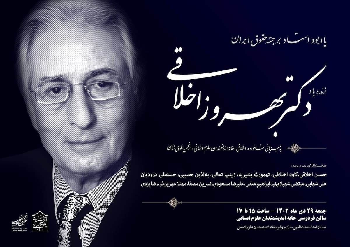 به گزارش روابط عمومی خانه اندیشمندان علوم انسانی، آیین یادبود دکتر بهروز اخلاقی به همت خانه اندیشمندان علوم انسانی و انجمن حقوق شناسی، روز جمعه ۲۹ دی ۱۴۰۲ ساعت ۱۵ در سالن فردوسی خانه اندیشمندان علوم انسانی برگزار می شود.