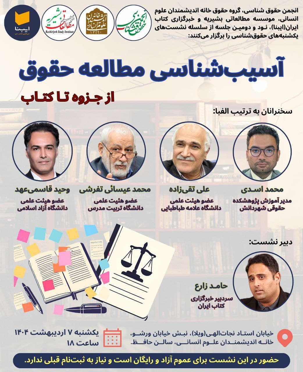به گزارش روابط عمومی خانه اندیشمندان علوم انسانی، نشست "آسیب شناسی مطالعه حقوق؛ از جزوه تا کتاب" به همت انجمن حقوق شناسی، گروه حقوق خانه اندیشمندان علوم انسانی، موسسه مطالعاتی بشیریه و خبرگزاری کتاب ایران(ایبنا)، روز یکشنبه 7 اردیبهشت 1404 ساعت 18 در سالن حافظ خانه اندیشمندان علوم انسانی برگزار می شود.