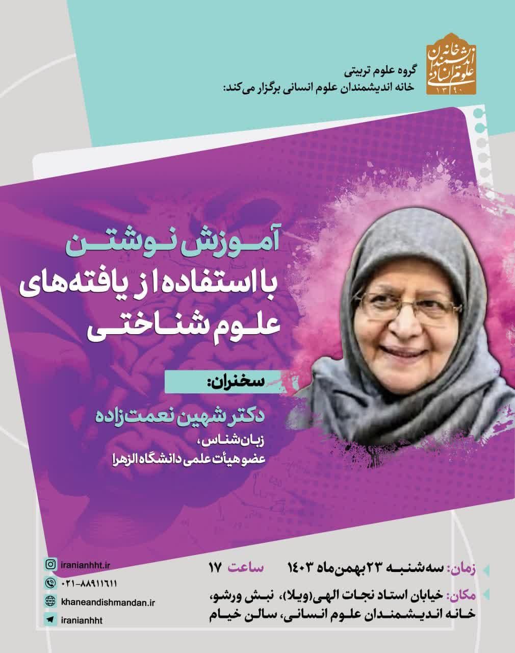 نشست "آموزش نوشتن با استفاده از یافته های علوم شناختی" روز سه شنبه 23 بهمن در سالن خیام خانه اندیشمندان علوم انسانی برگزار می شود.