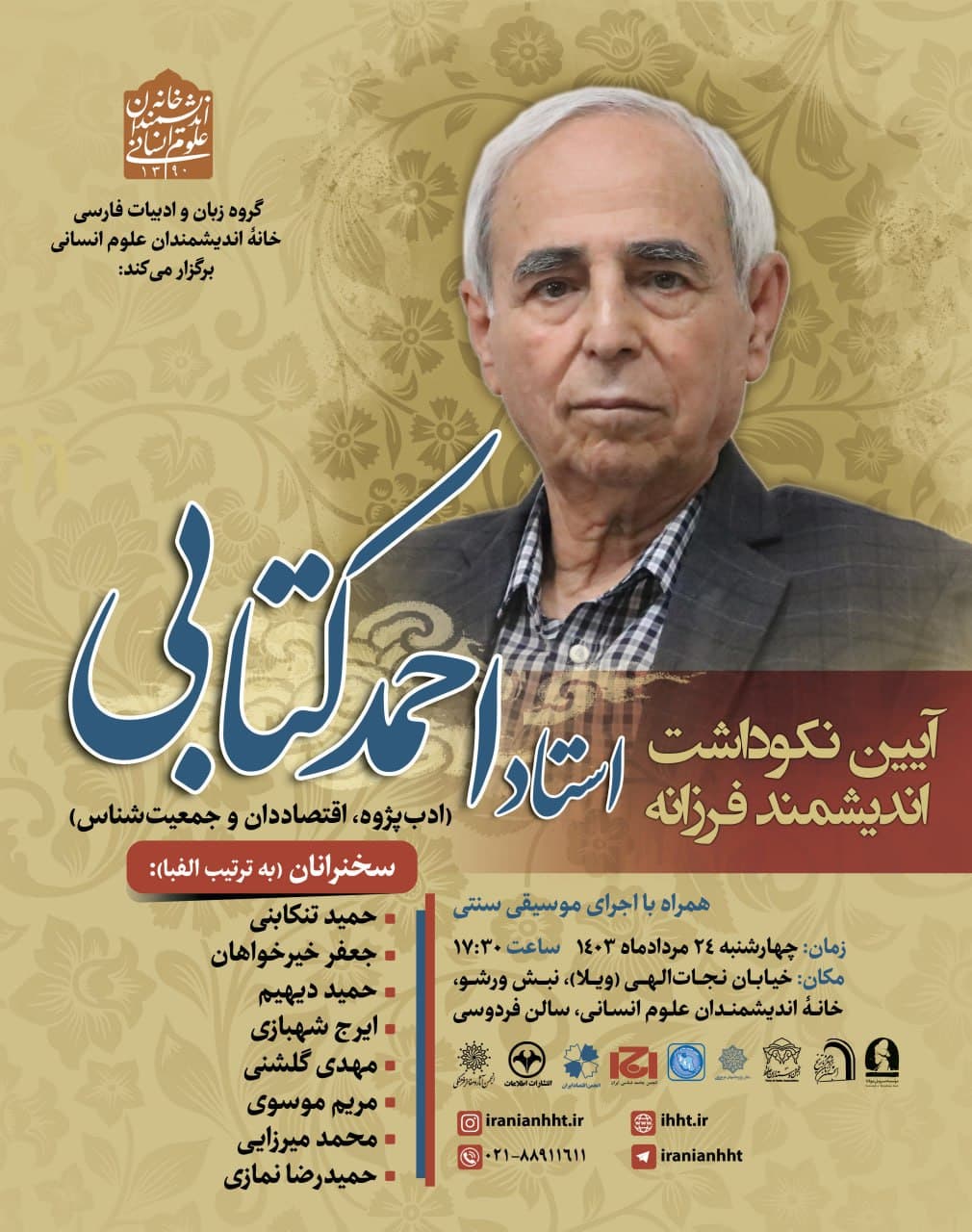 آیین نکوداشت "استاد احمد کتابی" روز چهارشنبه 24 مرداد در سالن فردوسی خانه اندیشمندان علوم انسانی برگزار می شود.