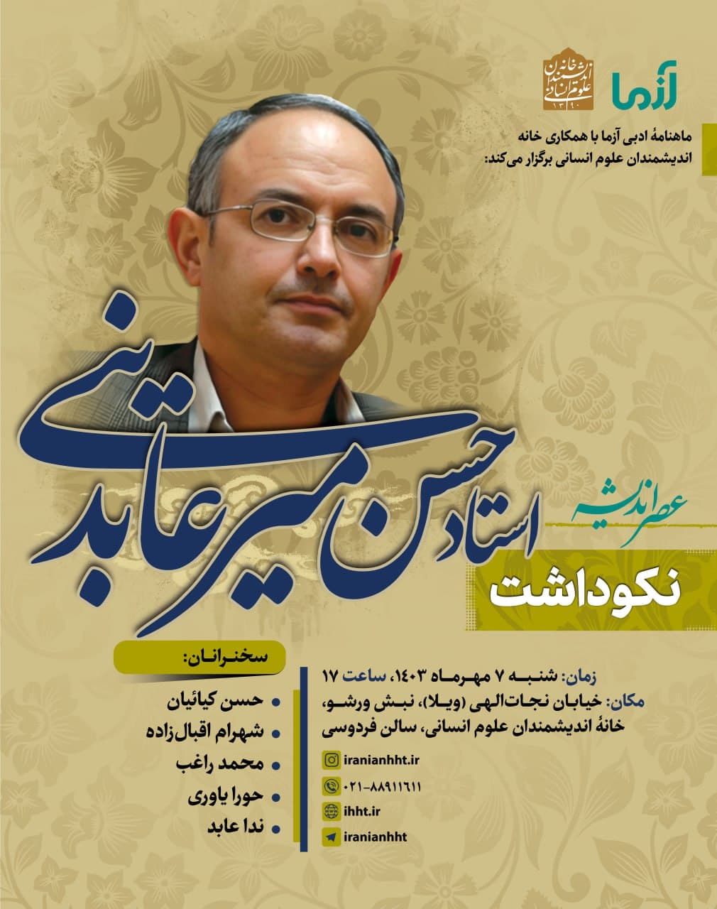 آیین نکوداشت "استاد حسن میرعابدینی" روز شنبه 7 مهر در سالن فردوسی خانه اندیشمندان علوم انسانی برگزار می شود.