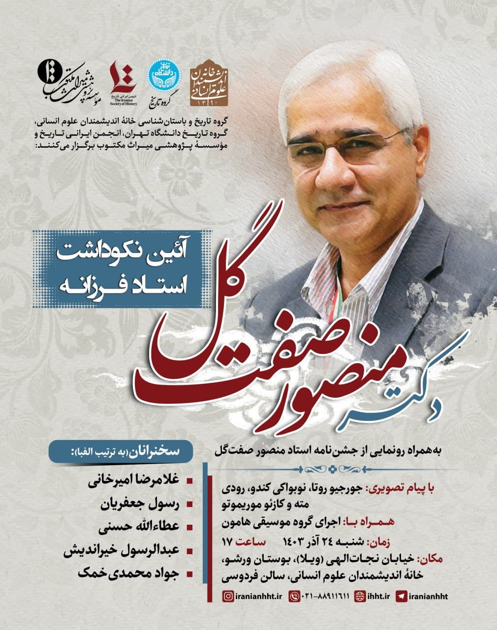 به گزارش روابط عمومی خانه اندیشمندان علوم انسانی، آیین نکوداشت استاد فرزانه "دکتر منصور صفت گل" به همت گروه تاریخ و باستان شناسی خانه اندیشمندان علوم انسانی، گروه تاریخ دانشگاه تهران، انجمن ایرانی تاریخ و موسسه پژوهشی میراث مکتوب، روز شنبه 24 آذر 1403 ساعت 17 در سالن فردوسی خانه اندیشمندان علوم انسانی برگزار می شود.