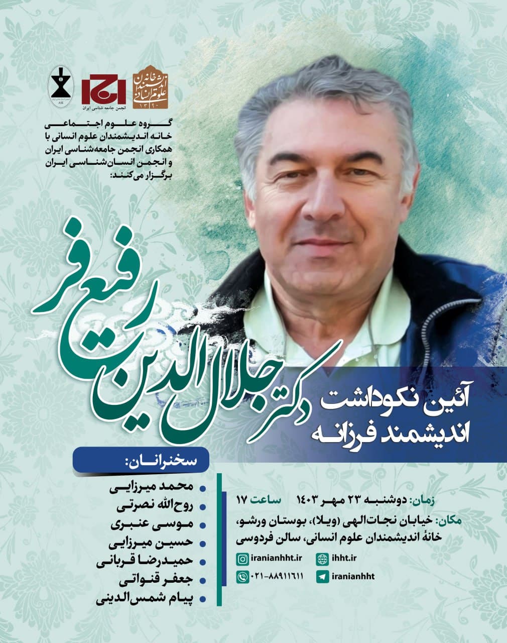 به گزارش روابط عمومی خانه اندیشمندان علوم انسانی، آیین نکوداشت "دکتر جلال الدین رفیع فر" به همت گروه علوم اجتماعی خانه اندیشمندان علوم انسانی و با همکاری انجمن جامعه شناسی ایران و انجمن انسان شناسی ایران، روز دوشنبه 23 مهر 1403 ساعت 17 در سالن فردوسی خانه اندیشمندان علوم انسانی برگزار می شود.