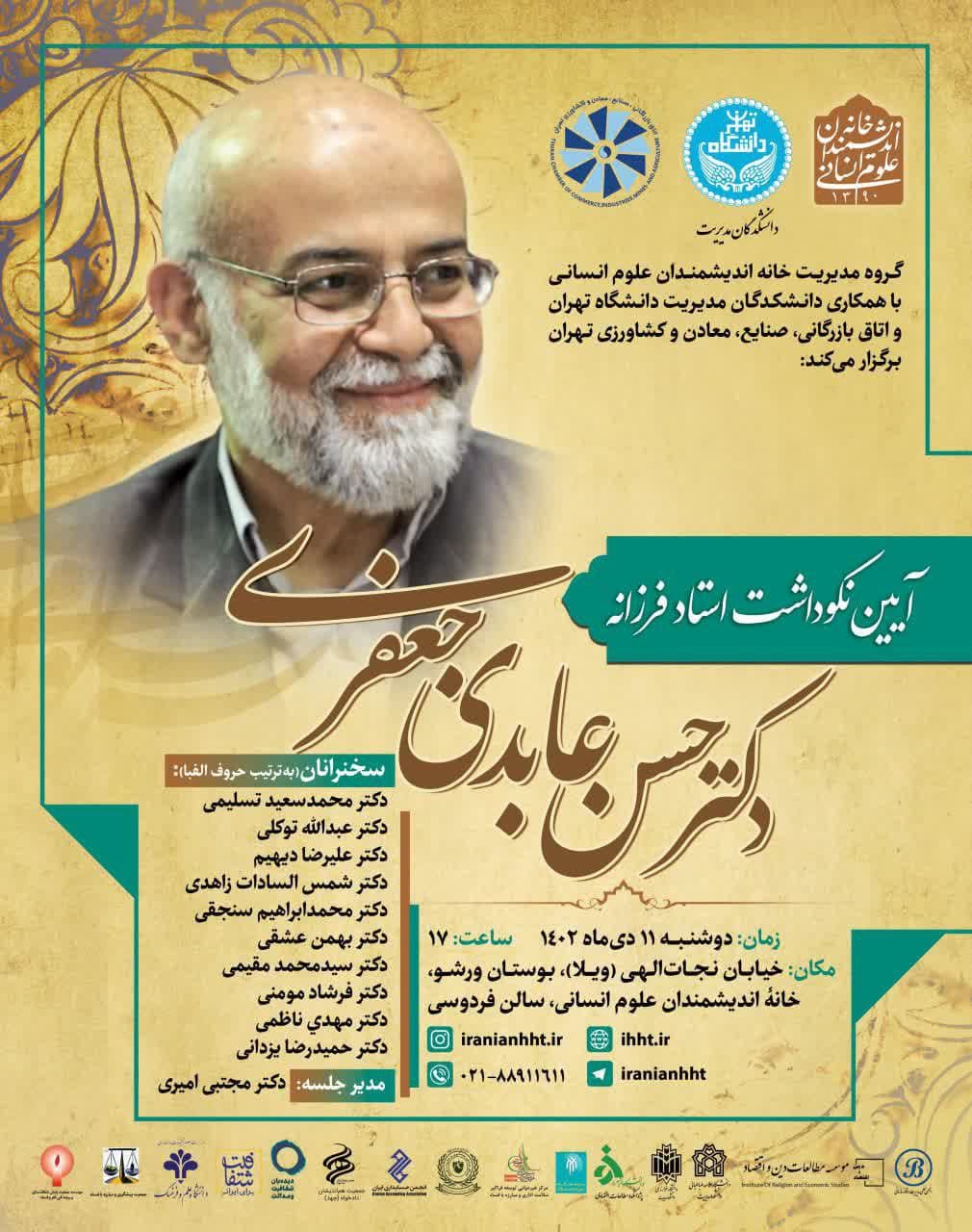 آیین نکوداشت "دکتر حسن عابدی جعفری" روز دوشنبه ۱۱ دی در سالن فردوسی خانه اندیشمندان علوم انسانی برگزار می شود.
