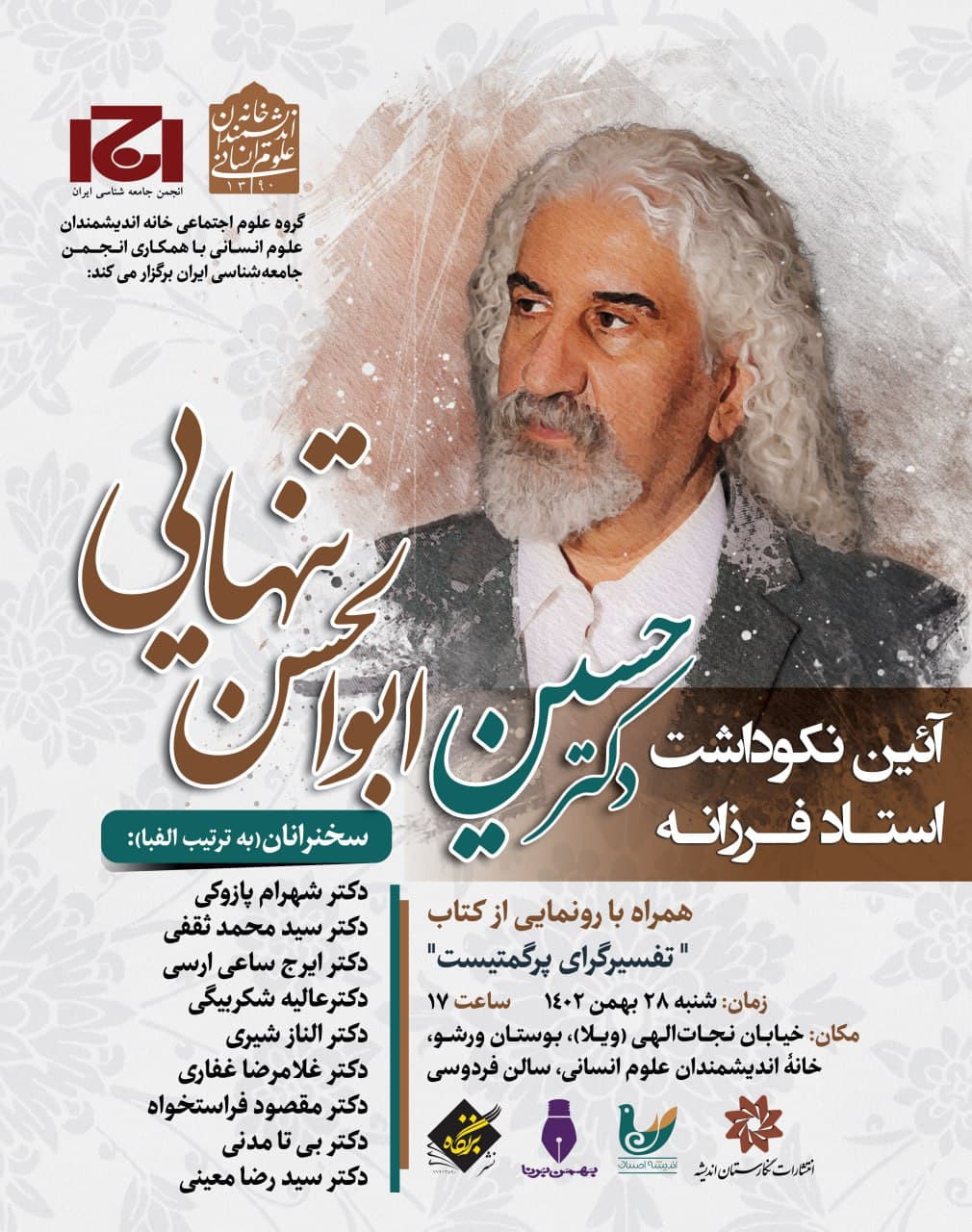 آیین نکوداشت "دکتر حسین ابوالحسن تنهایی" روز شنبه ۲۸ بهمن در سالن فردوسی خانه اندیشمندان علوم انسانی برگزار می شود.