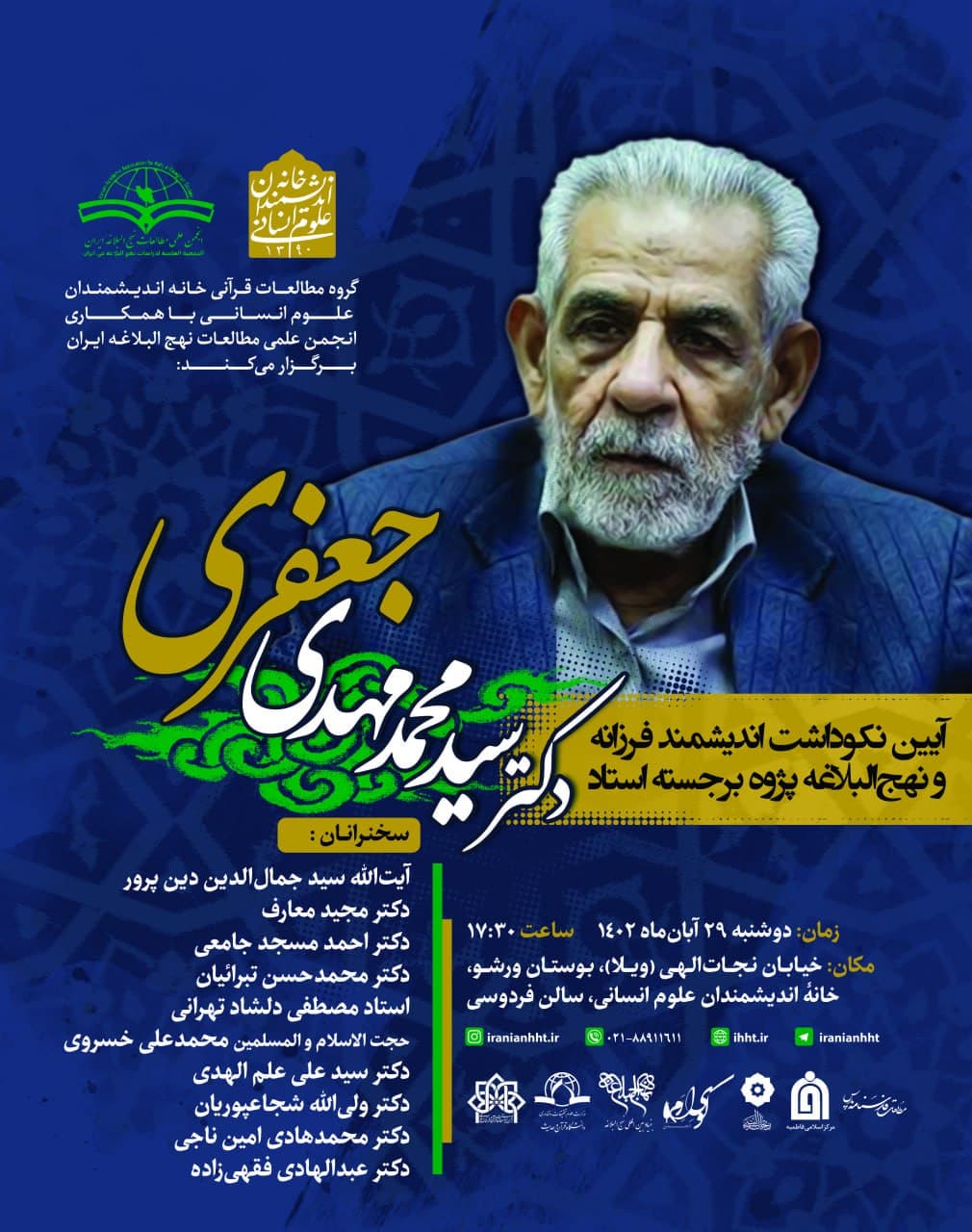 به گزارش روابط عمومی خانه اندیشمندان علوم انسانی، آیین نکوداشت "دکتر سید محمدمهدی جعفری" به همت گروه مطالعات قرآنی خانه اندیشمندان علوم انسانی و با همکاری انجمن علمی مطالعات نهج البلاغه ایران، روز دوشنبه ۲۹ آبان ۱۴۰۲ ساعت ۱۷:۳۰ در سالن فردوسی خانه اندیشمندان علوم انسانی برگزار می شود.