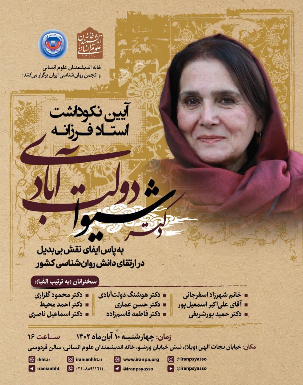 به گزارش روابط عمومی خانه اندیشمندان علوم انسانی، آیین نکوداشت "دکتر شیوا دولت آبادی" به همت انجمن روان شناسی ایران و گروه روانشناسی خانه اندیشمندان علوم انسانی، روز چهارشنبه ۱۰ آبان ۱۴۰۲ ساعت ۱۶ در سالن فردوسی خانه اندیشمندان علوم انسانی برگزار می شود.
