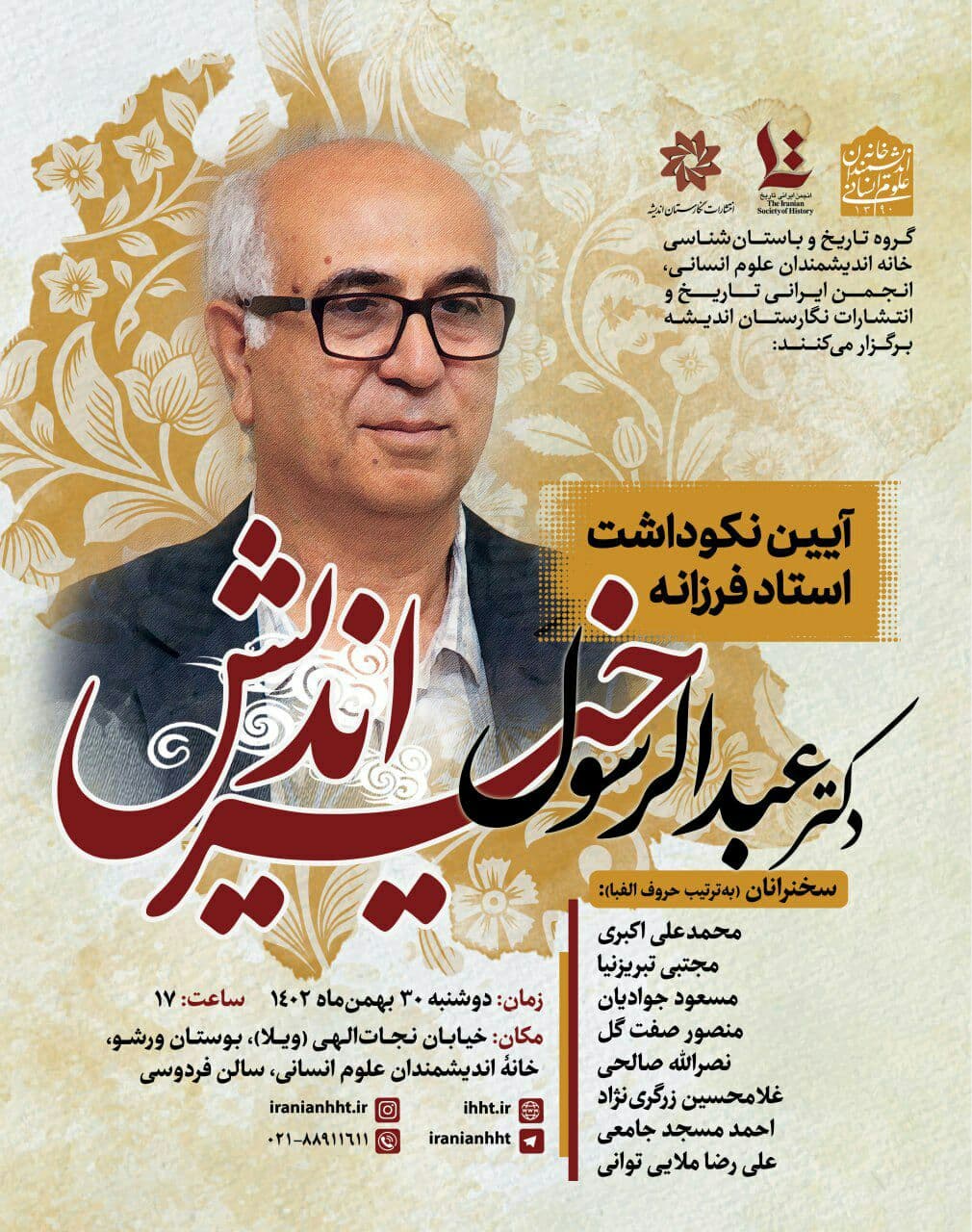 به گزارش روابط عمومی خانه اندیشمندان علوم انسانی، آیین نکوداشت "دکتر عبدالرسول خیراندیش" به همت گروه تاریخ و باستان شناسی خانه اندیشمندان علوم انسانی، انجمن ایرانی تاریخ و انتشارات نگارستان اندیشه، روز دوشنبه ۳۰ بهمن ۱۴۰۲ ساعت ۱۷ در سالن فردوسی خانه اندیشمندان علوم انسانی برگزار می شود.
