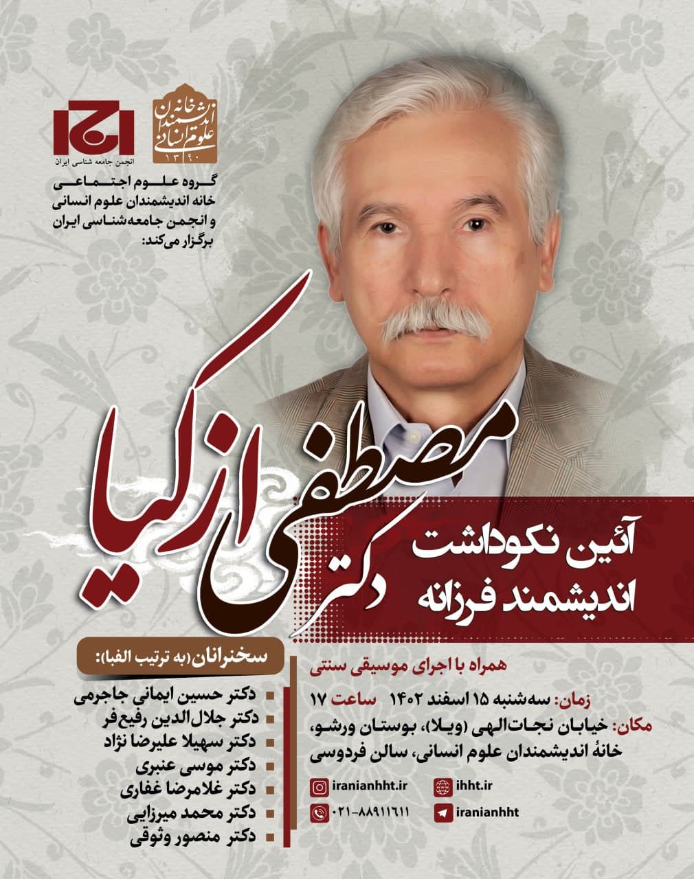 آیین نکوداشت "دکتر مصطفی ازکیا" روز سه شنبه ۱۵ اسفند در سالن فردوسی خانه اندیشمندان علوم انسانی برگزار می شود.