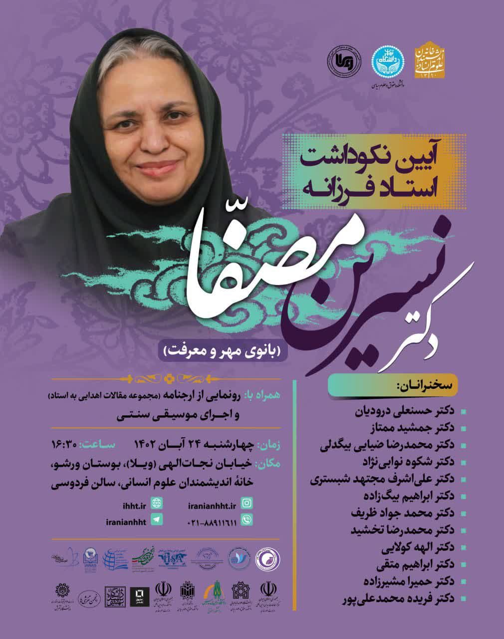 آیین "نکوداشت دکتر نسرین مصفا" روز چهارشنبه ۲۴ آبان در سالن فردوسی خانه اندیشمندان علوم انسانی برگزار می شود.