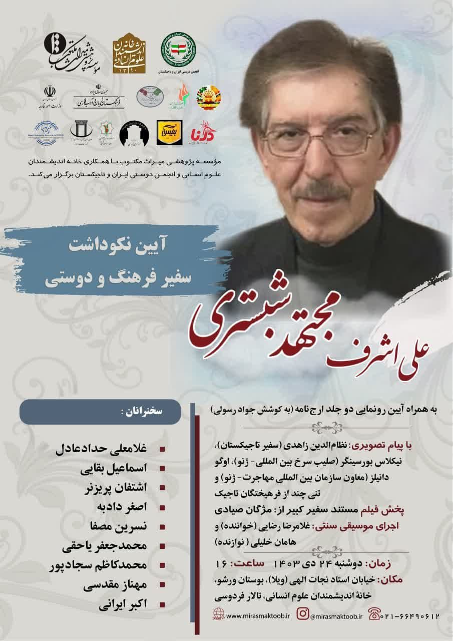 آیین نکوداشت "سفیر فرهنگ و دوستی، علی اشرف مجتهد شبستری" روز دوشنبه 24 دی در سالن فردوسی خانه اندیشمندان علوم انسانی برگزار می شود.