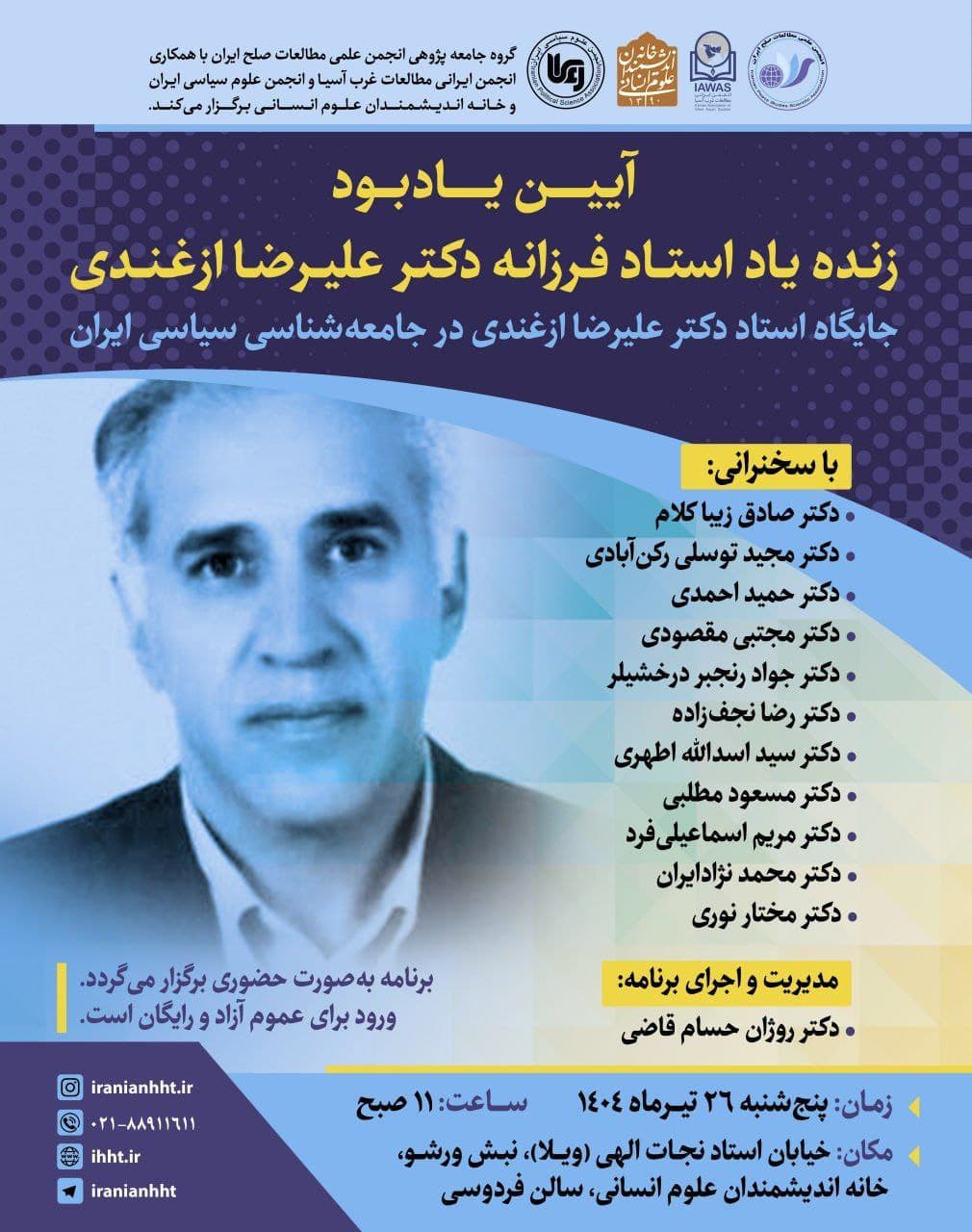 به گزارش روابط عمومی خانه اندیشمندان علوم انسانی، آیین یادبود زنده یاد "دکتر علیرضا ازغندی" به همت انجمن مطالعات صلح ایران و با همکاری انجمن مطالعات غرب آسیا و خانه اندیشمندان علوم انسانی، روز پنج شنبه 26 تیر 1404 ساعت 11 در سالن فردوسی خانه اندیشمندان علوم انسانی برگزار می شود.