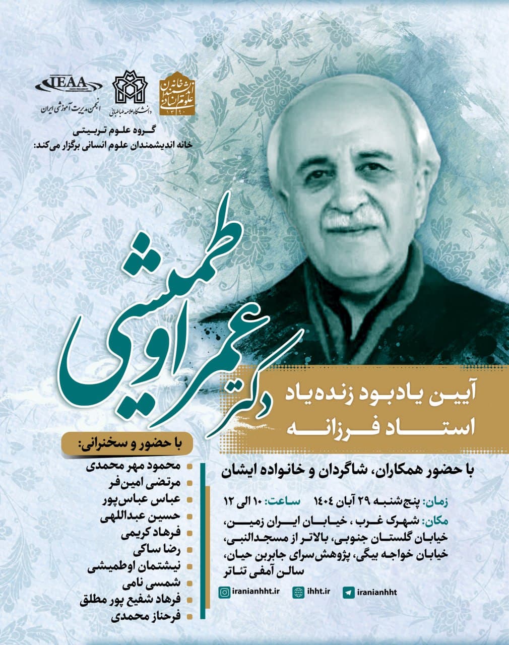آیین یادبود "زنده یاد دکتر عمر اوطمیشی" روز پنج شنبه 29 آبان در پژوهش سرای جابربن حیان برگزار می شود.